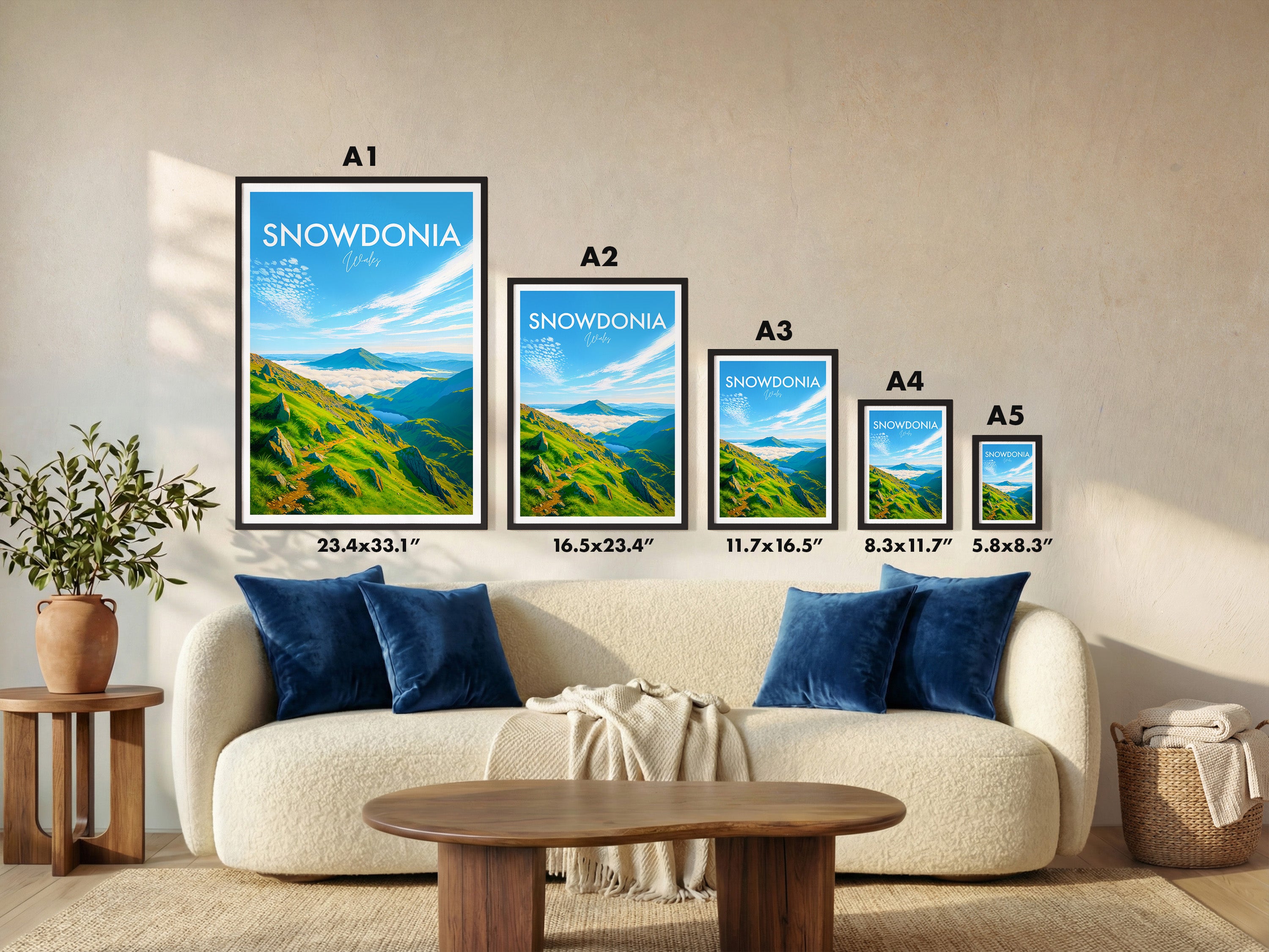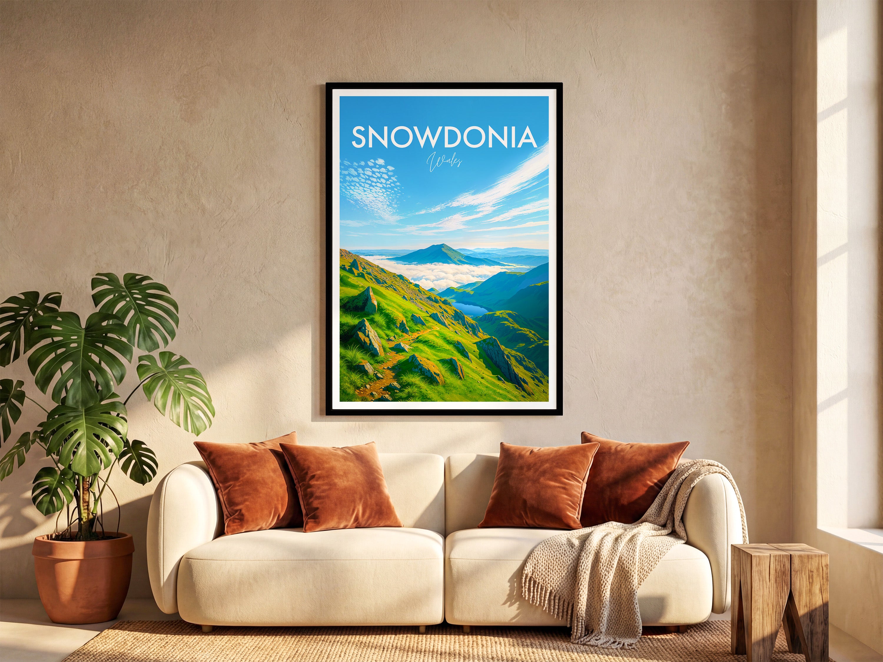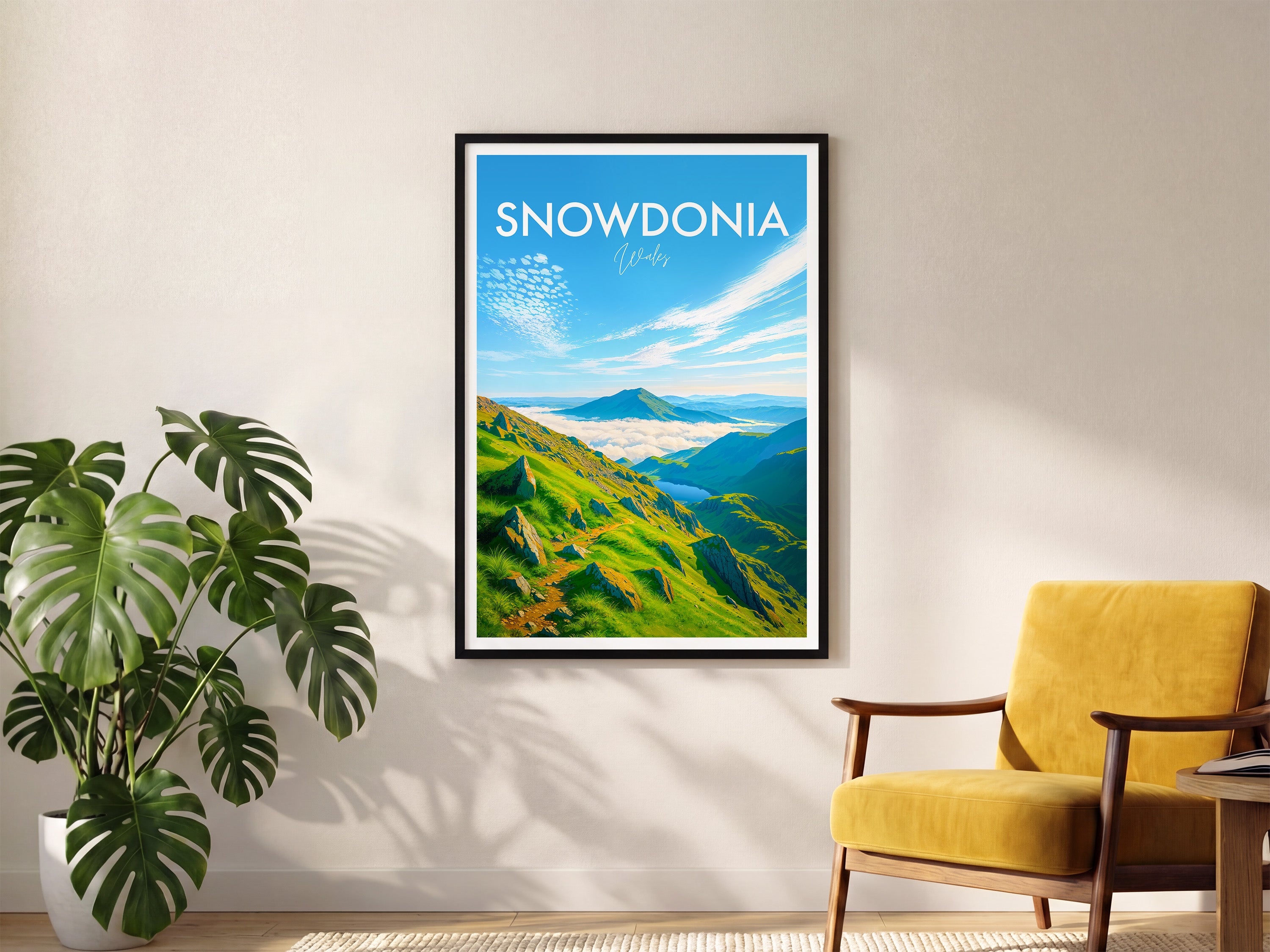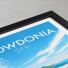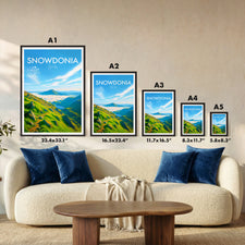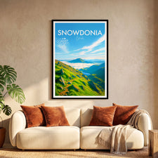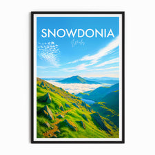 Bring the wild beauty of Wales into your home with this illustrated print. Enjoy the sweeping green valleys and captivating summit clouds of Snowdonia (Eryri National Park).