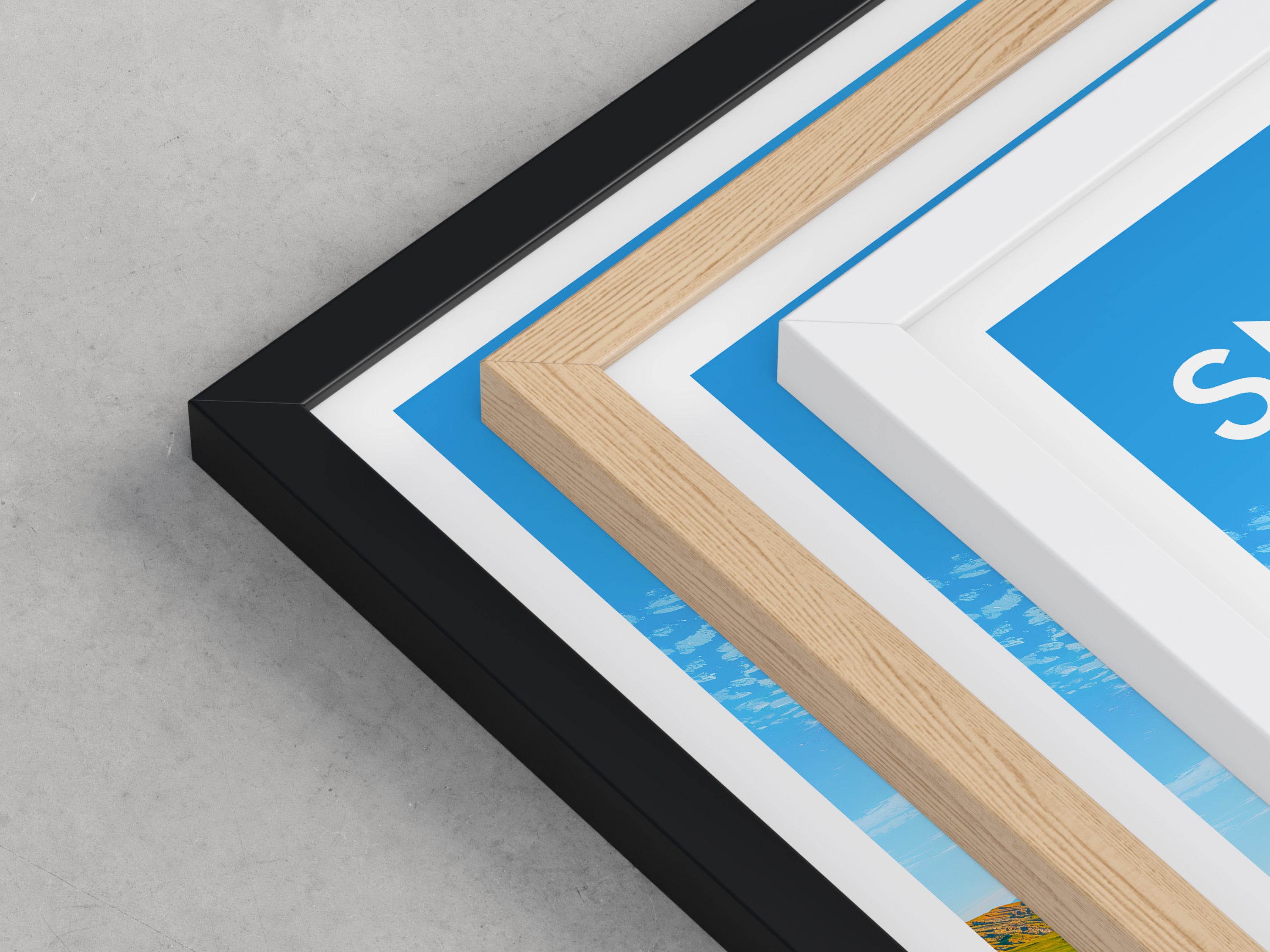Framed options use sustainably sourced wooden frames in black, white, or natural wood, ready to hang.