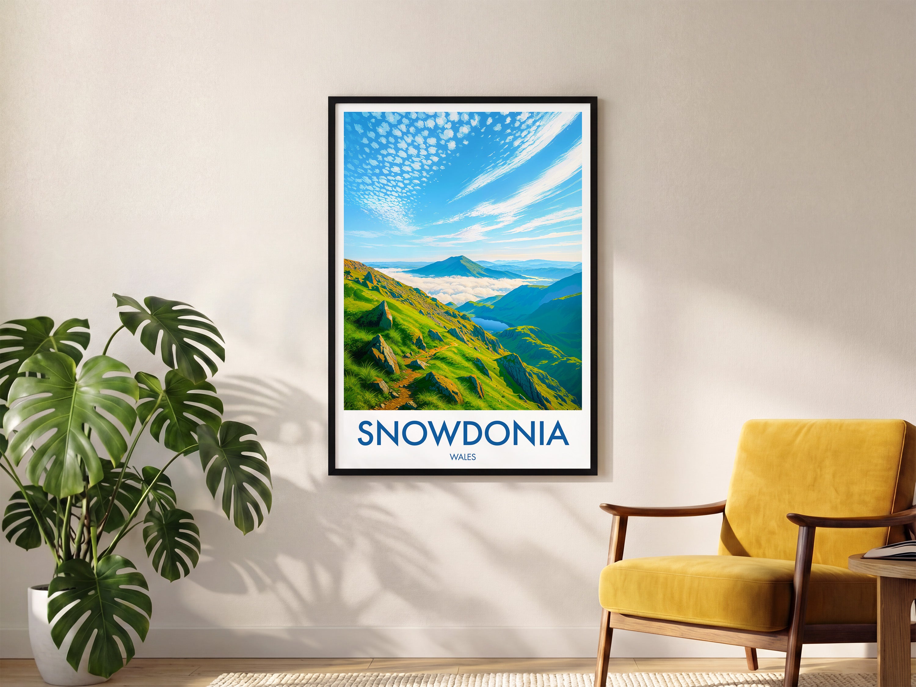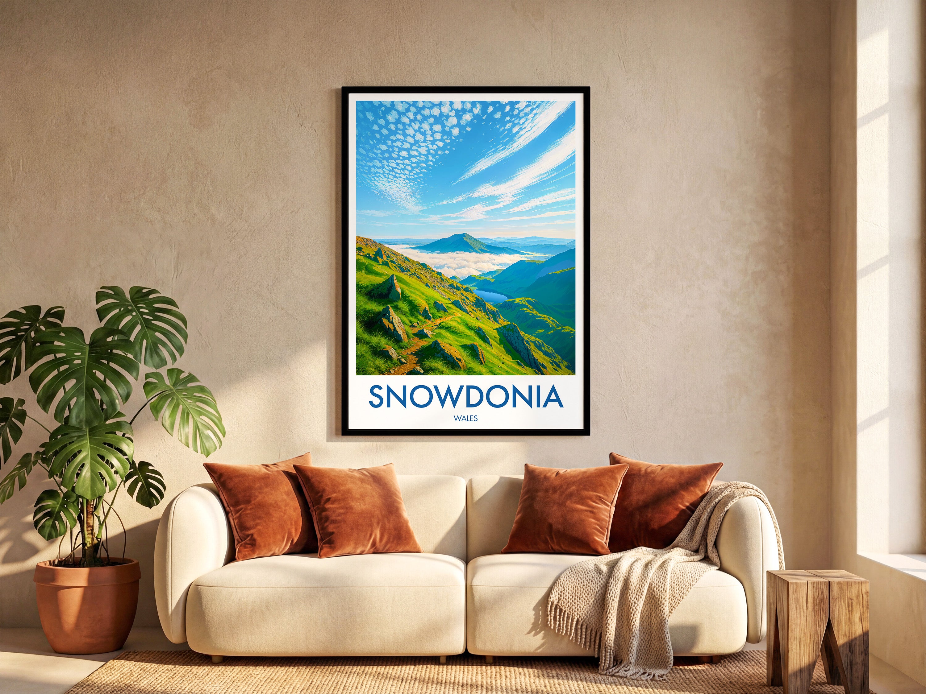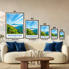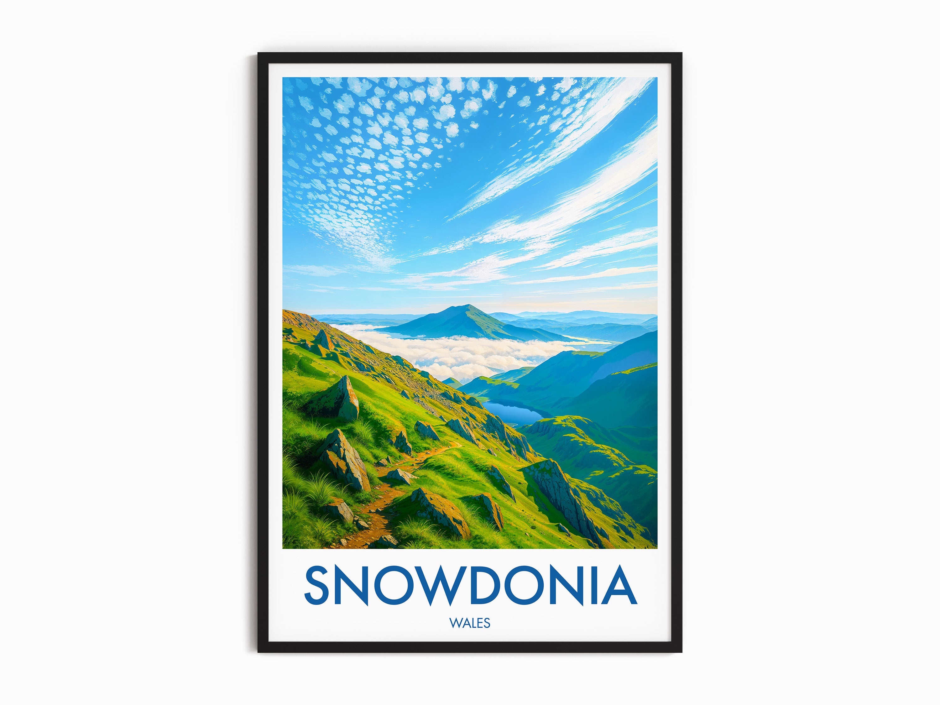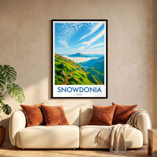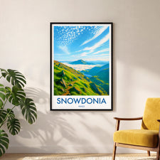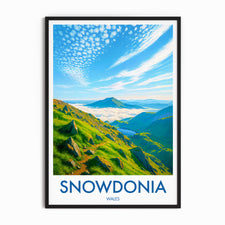 Bring the wild beauty of Wales into your home with this illustrated print. Enjoy the sweeping green valleys and captivating summit clouds of Snowdonia (Eryri National Park).