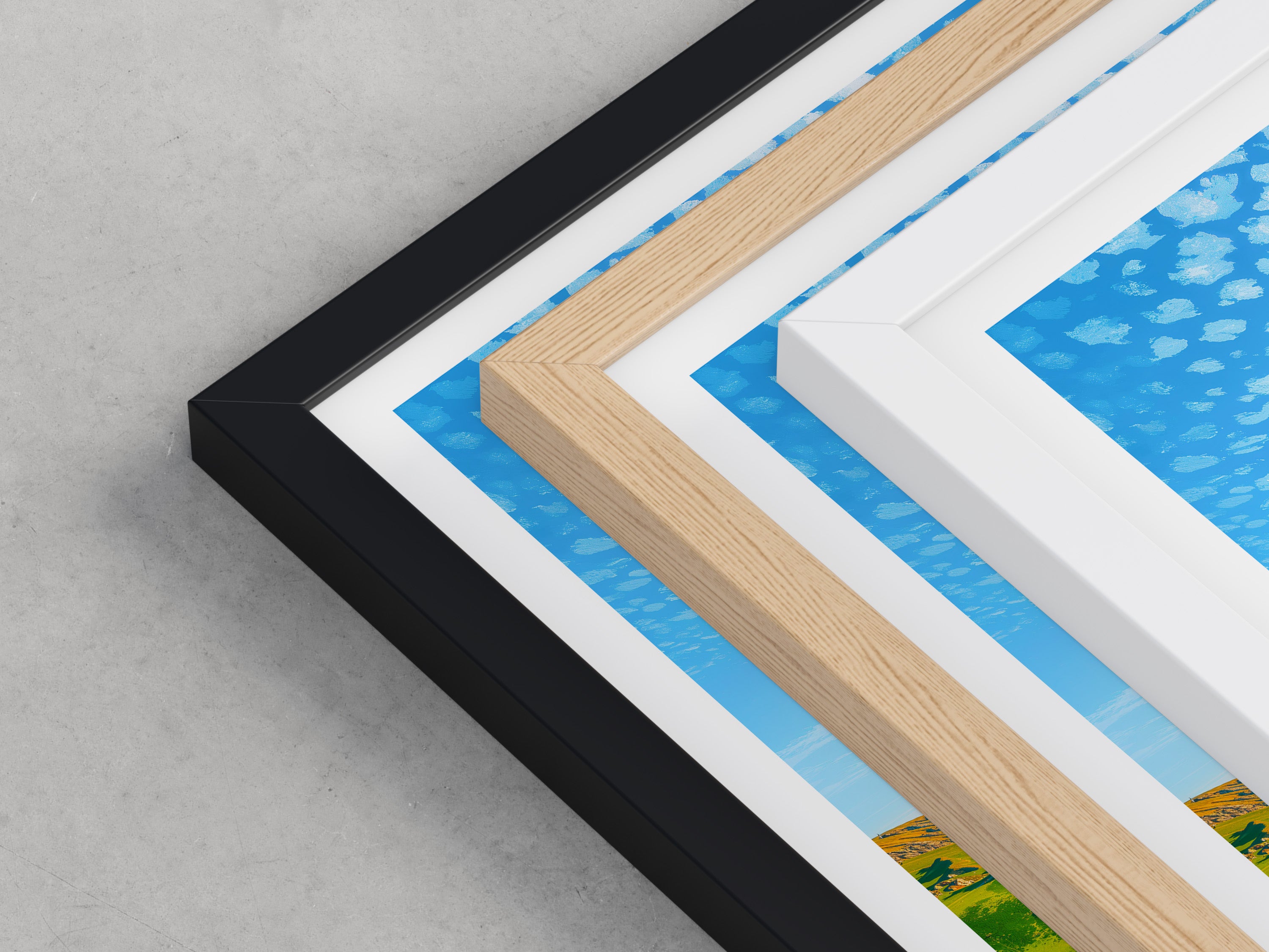 Framed options use sustainably sourced wooden frames in black, white, or natural wood, ready to hang.