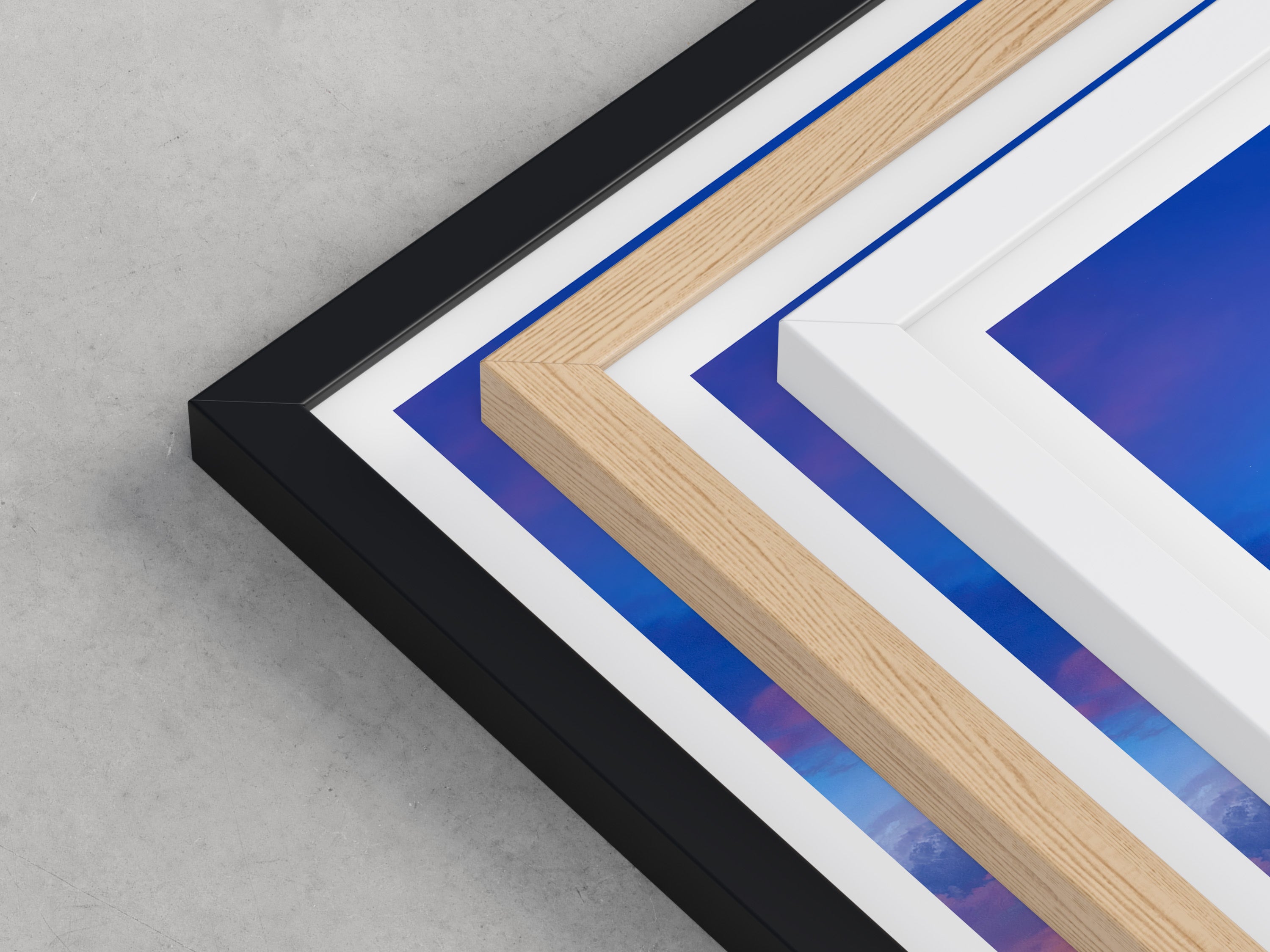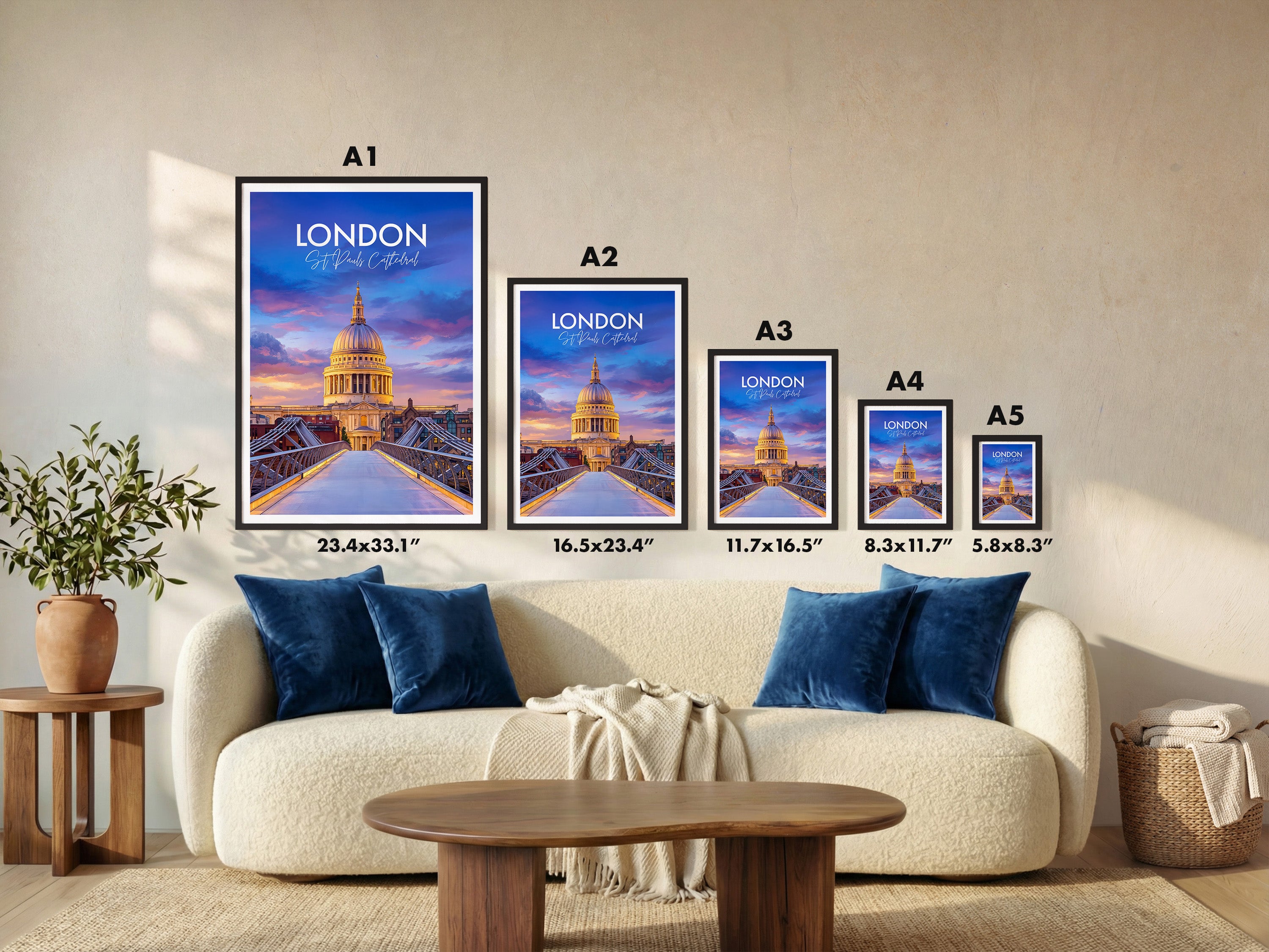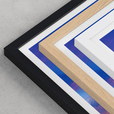 Framed options use sustainably sourced wooden frames in black, white, or natural wood, ready to hang.