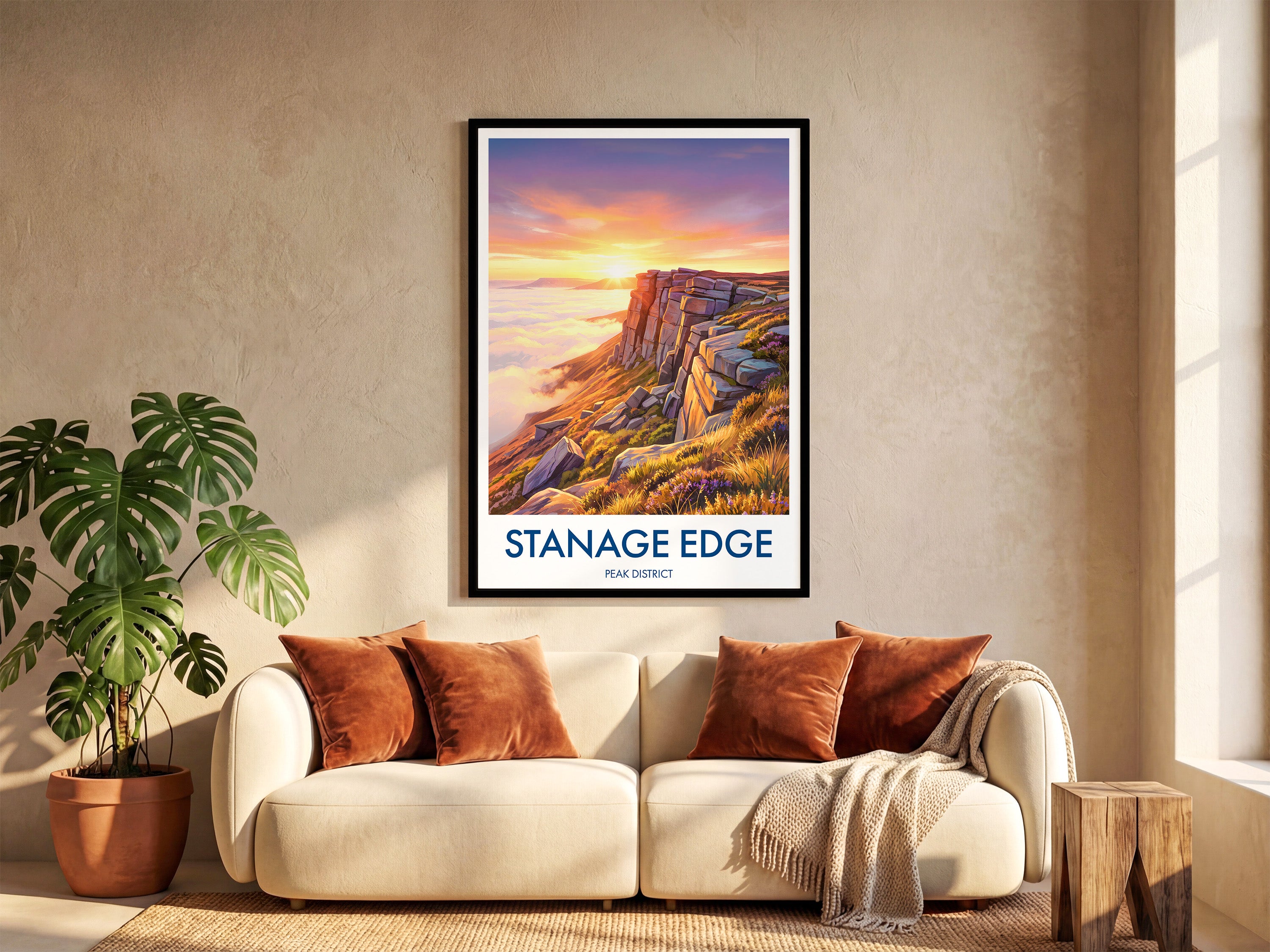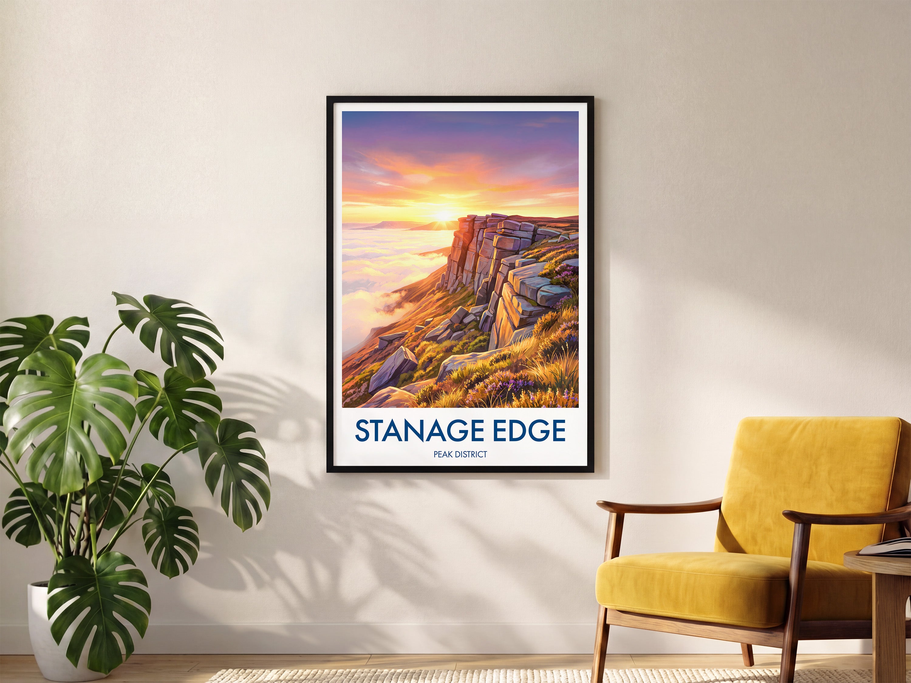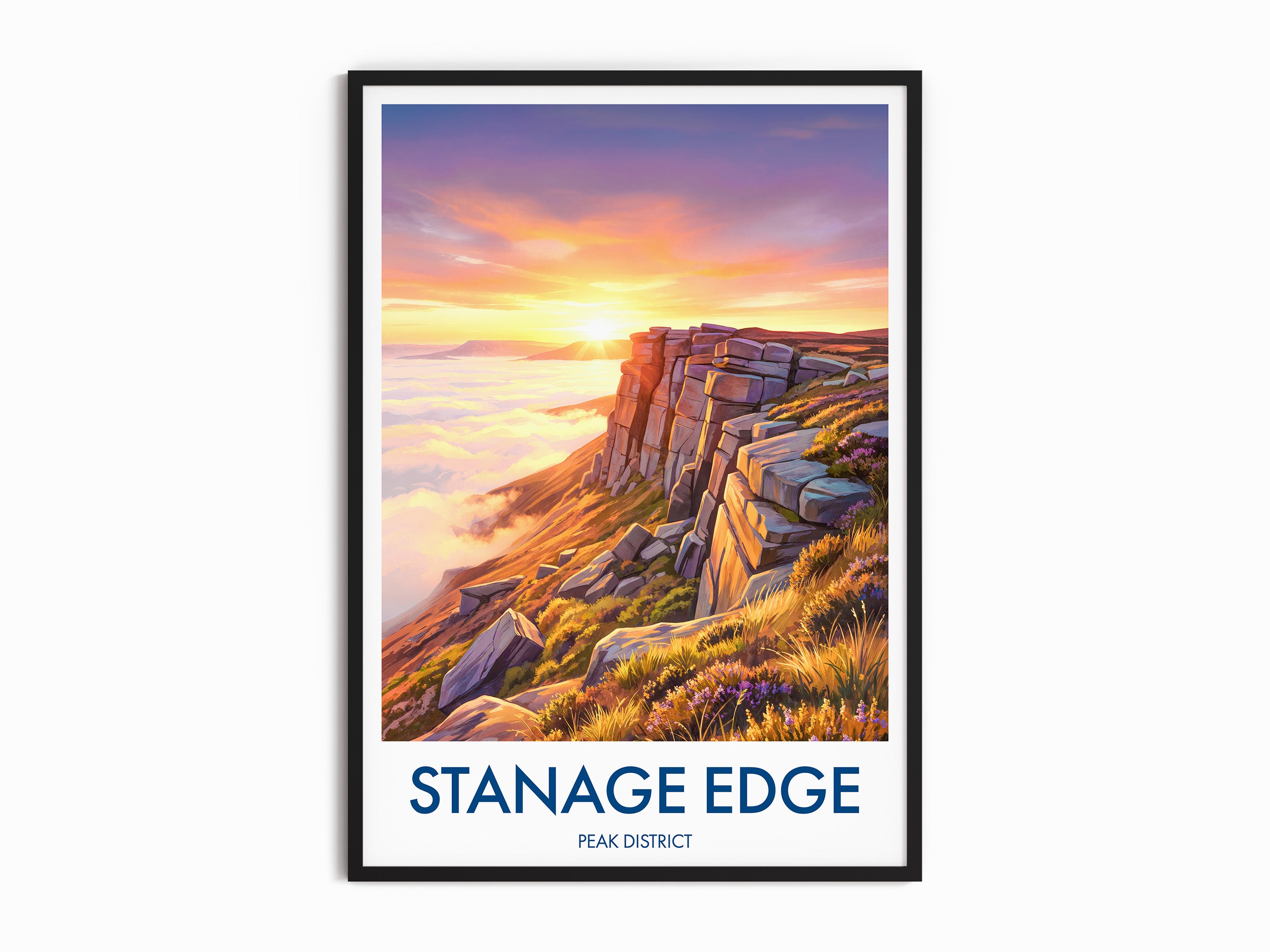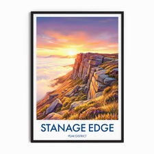 Bring the rugged beauty of Stanage Edge in the Peak District into your home with this vibrant travel poster print. Capturing the dramatic cliffs and expansive landscape, it's a perfect tribute to one of the UK's most beloved hiking destinations. Ideal for wall decor, thoughtful gifting, or as a reminder of breathtaking countryside adventures.