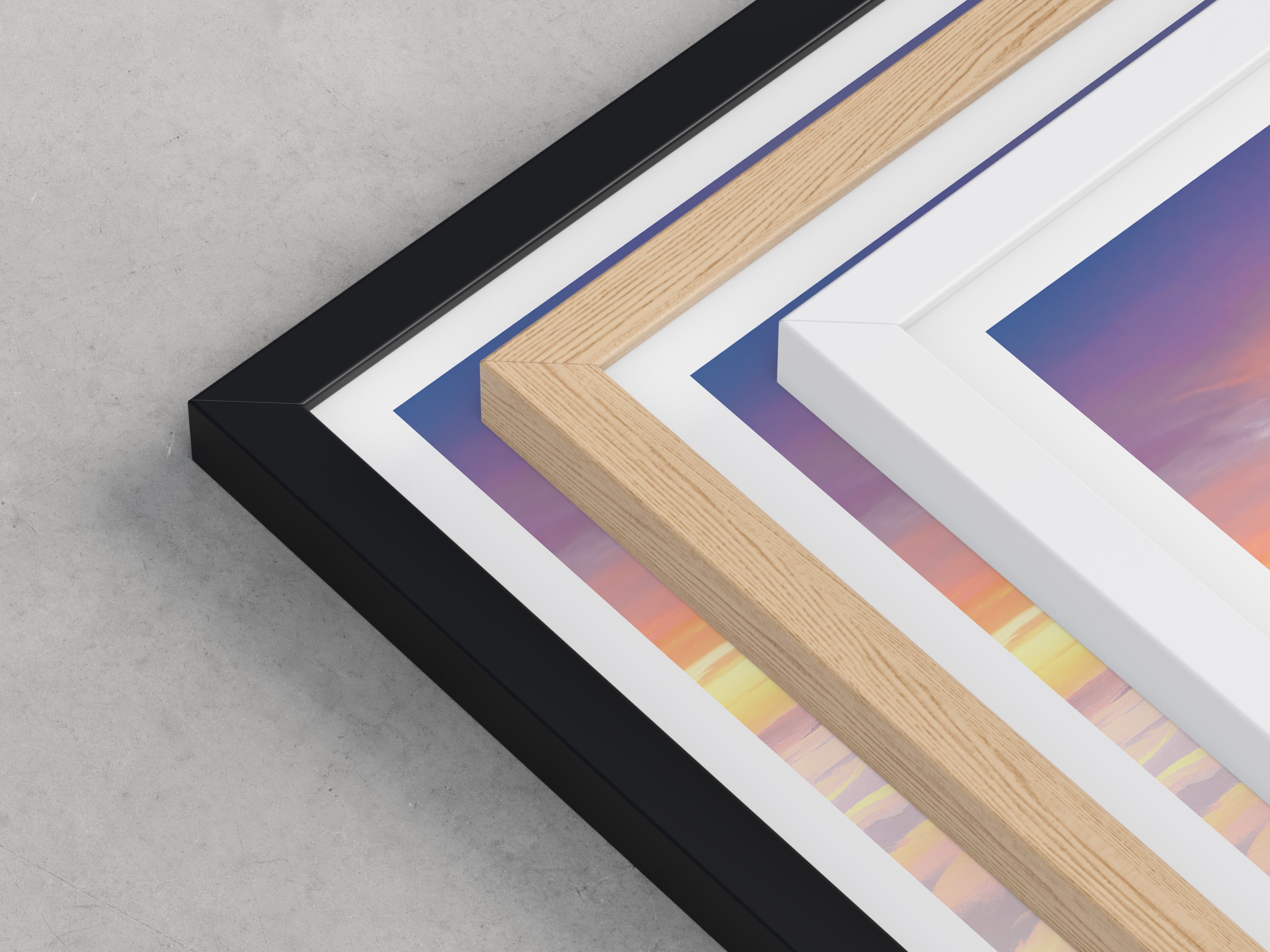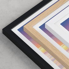 Framed options use sustainably sourced wooden frames in black, white, or natural wood, ready to hang.