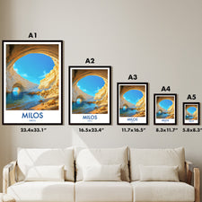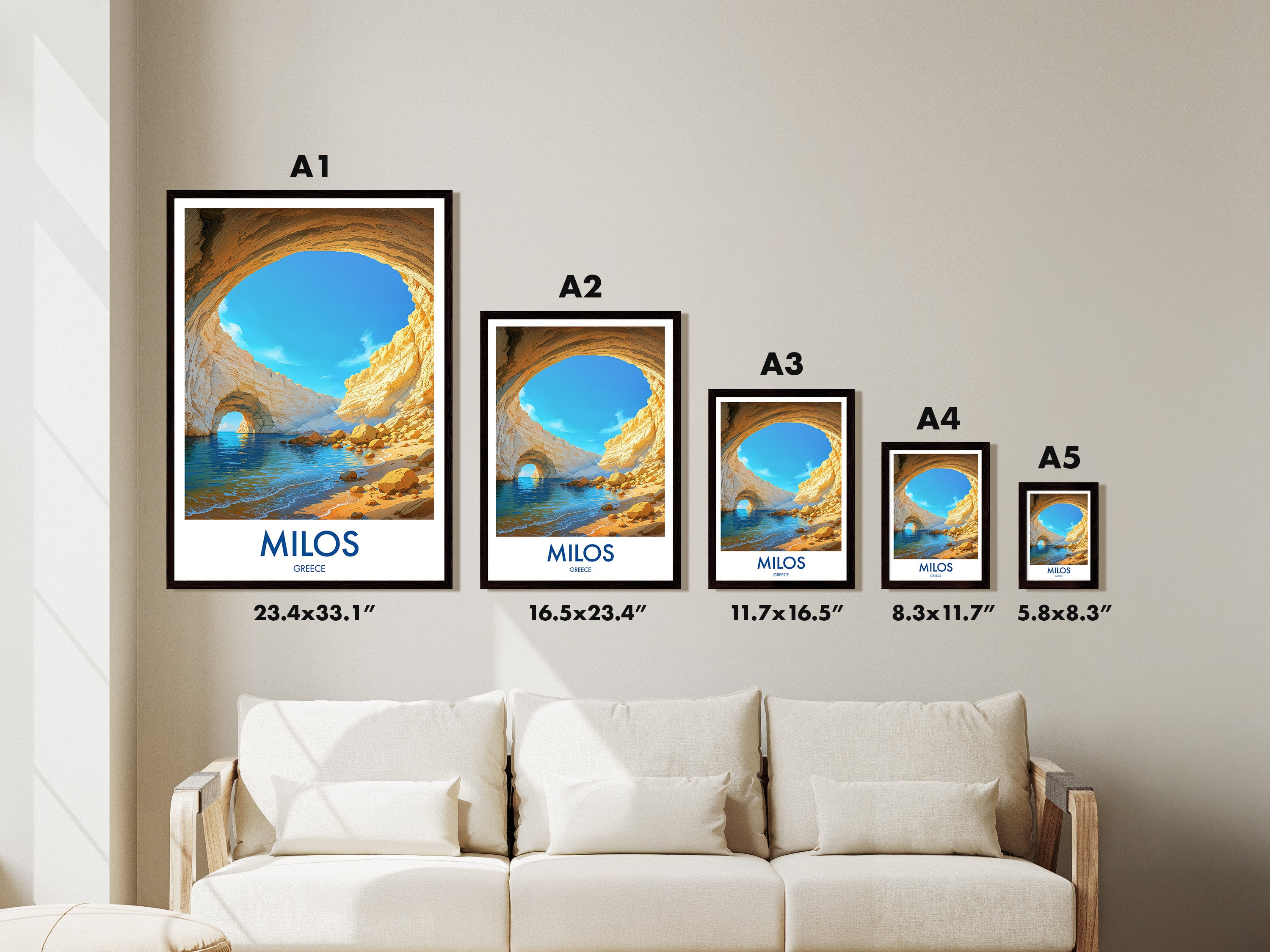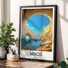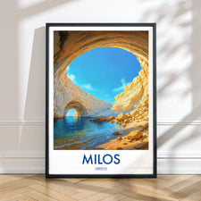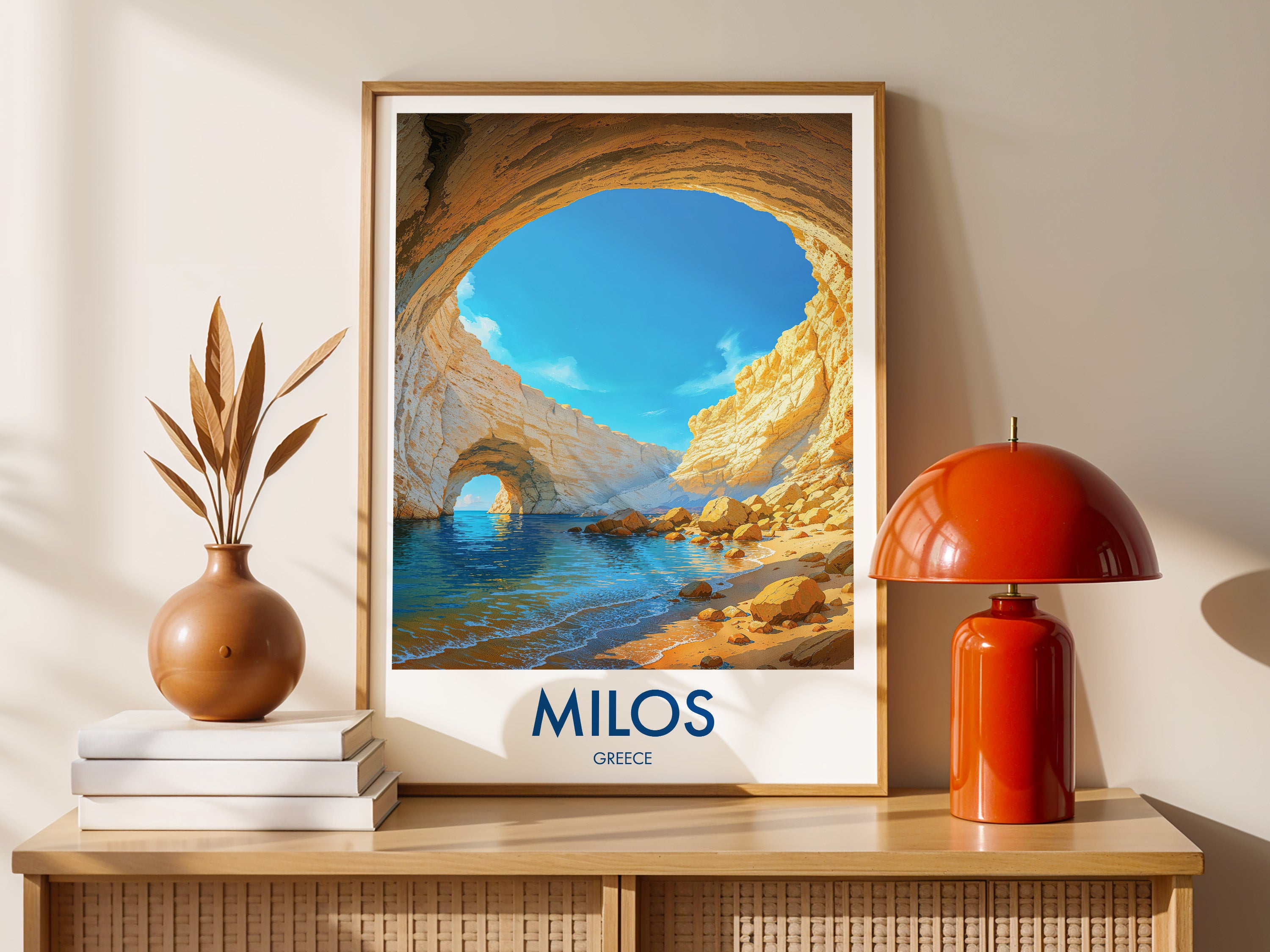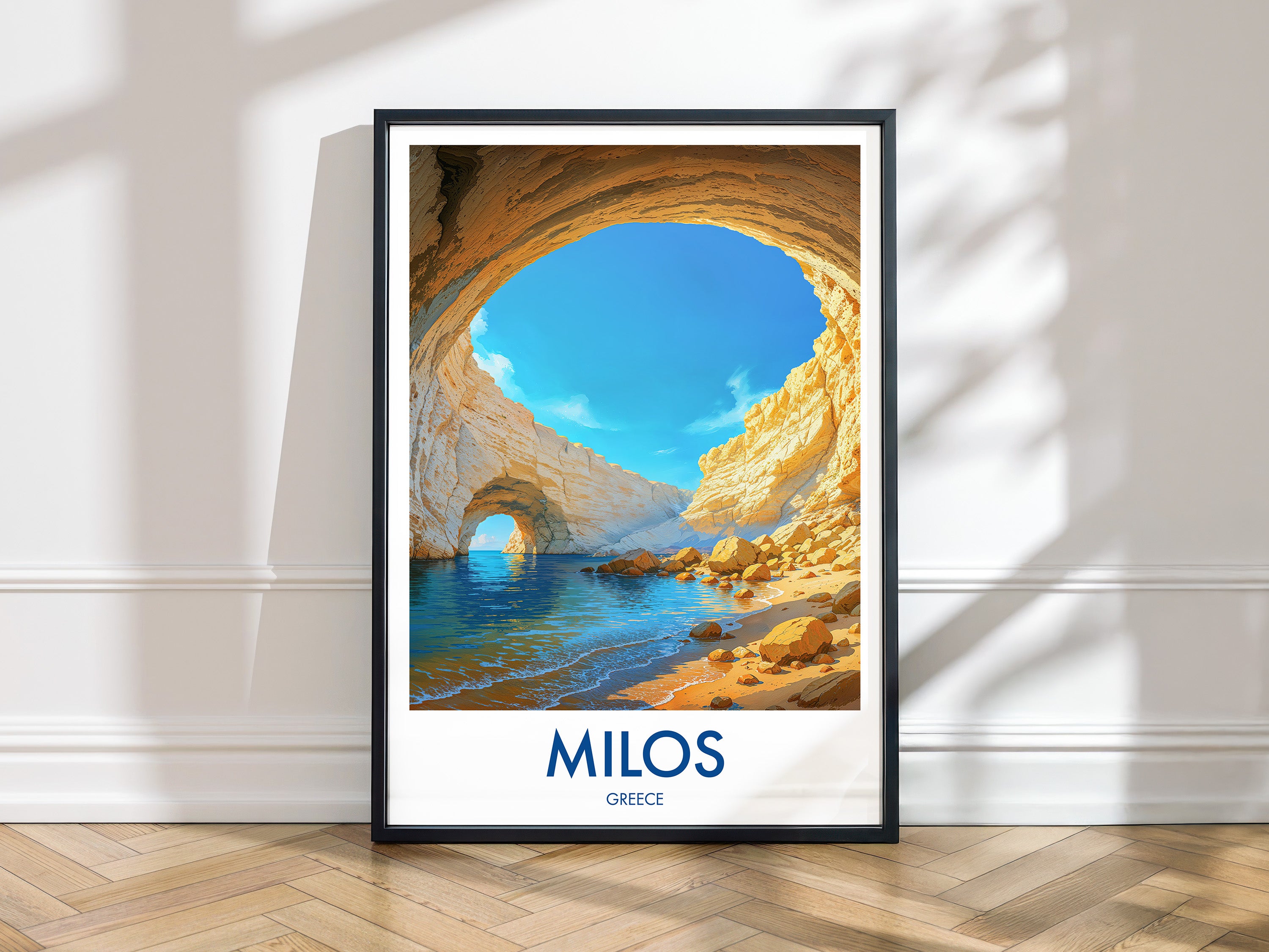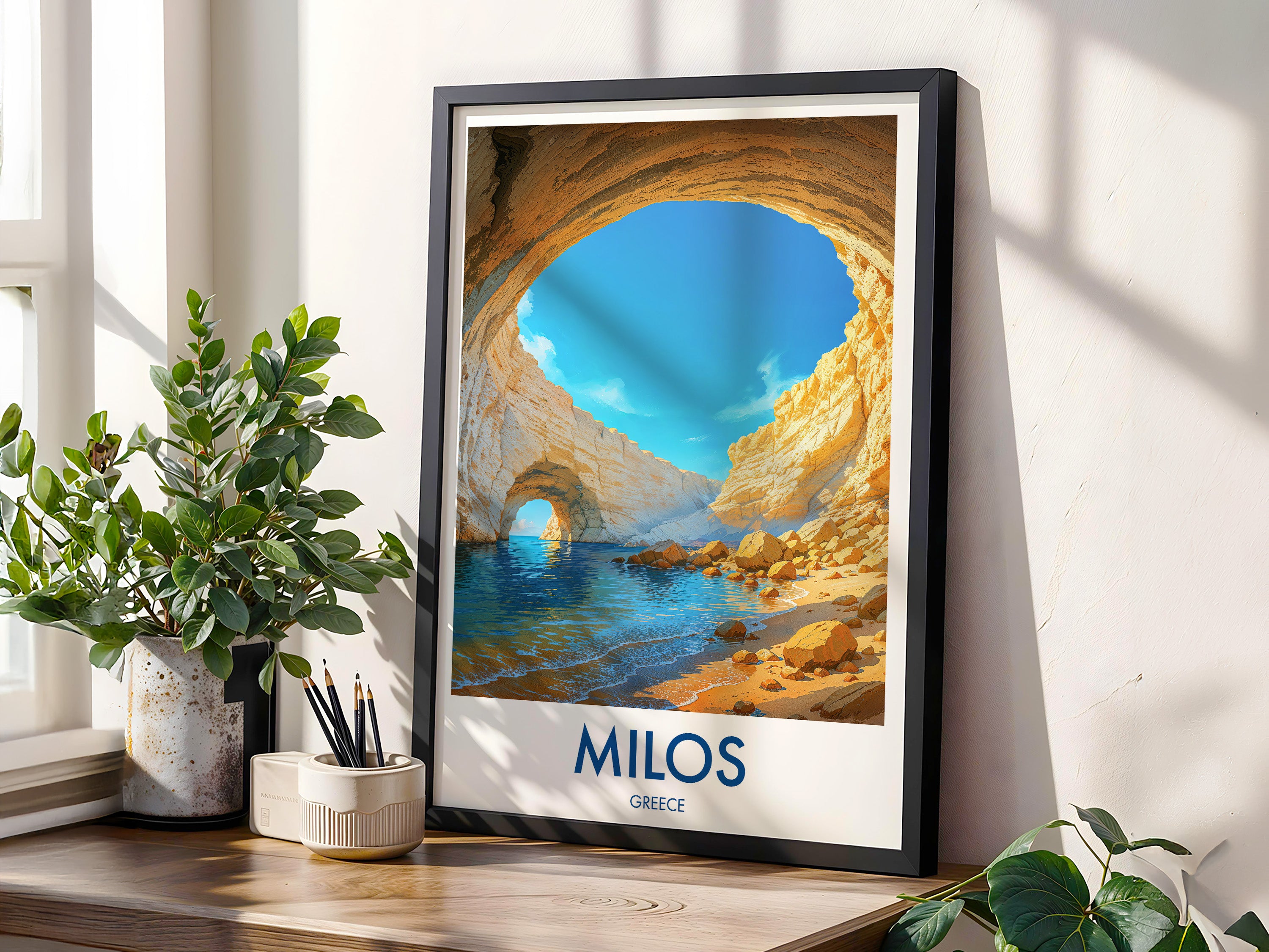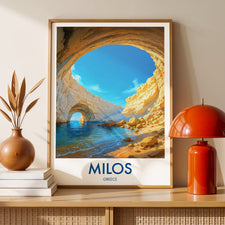 Celebrate the stunning beauty of Sykia Cave in Milos with this illustrated print. Featuring sunlit rock arches and turquoise waters, it’s perfect for lovers of Greek island serenity.