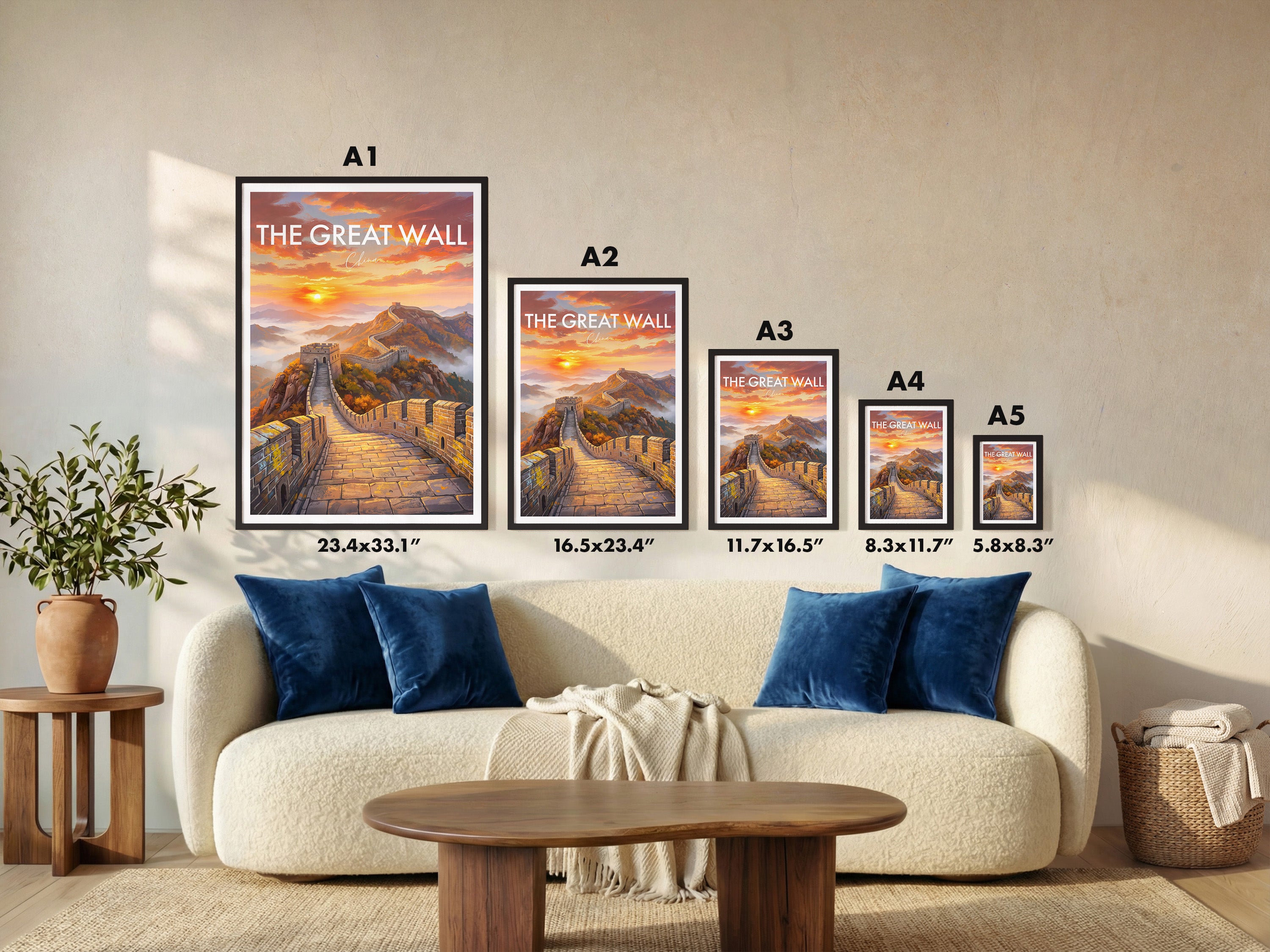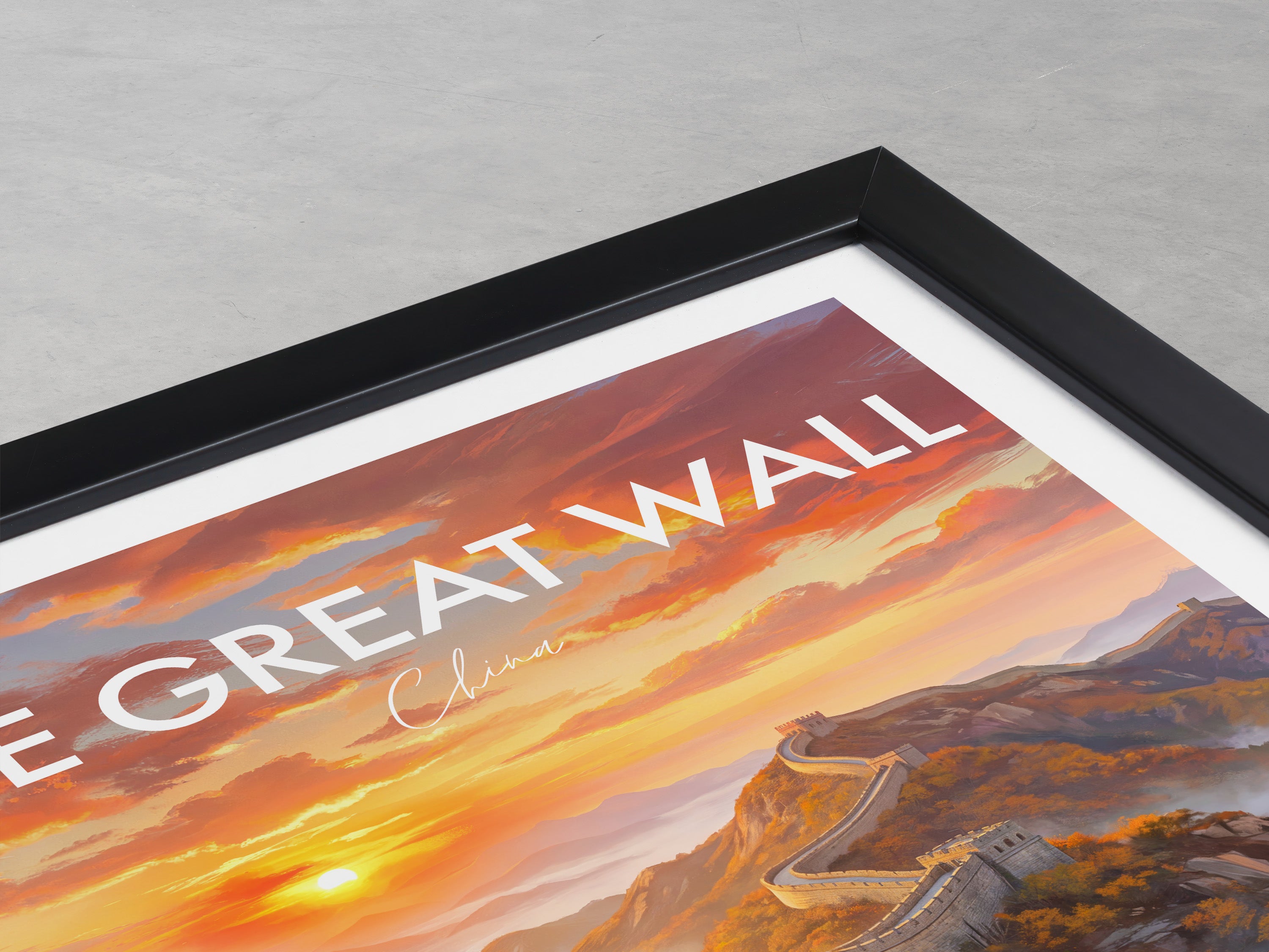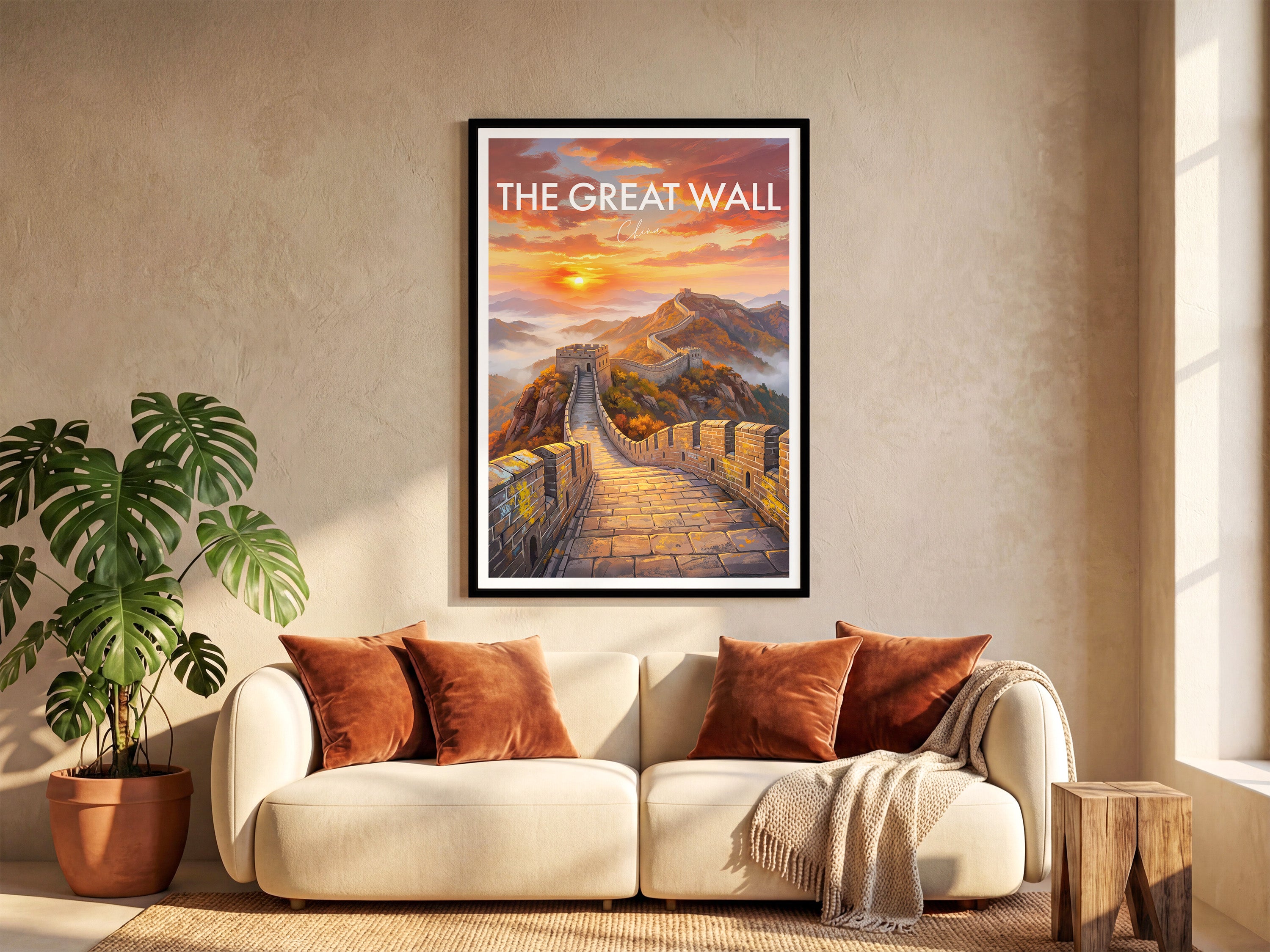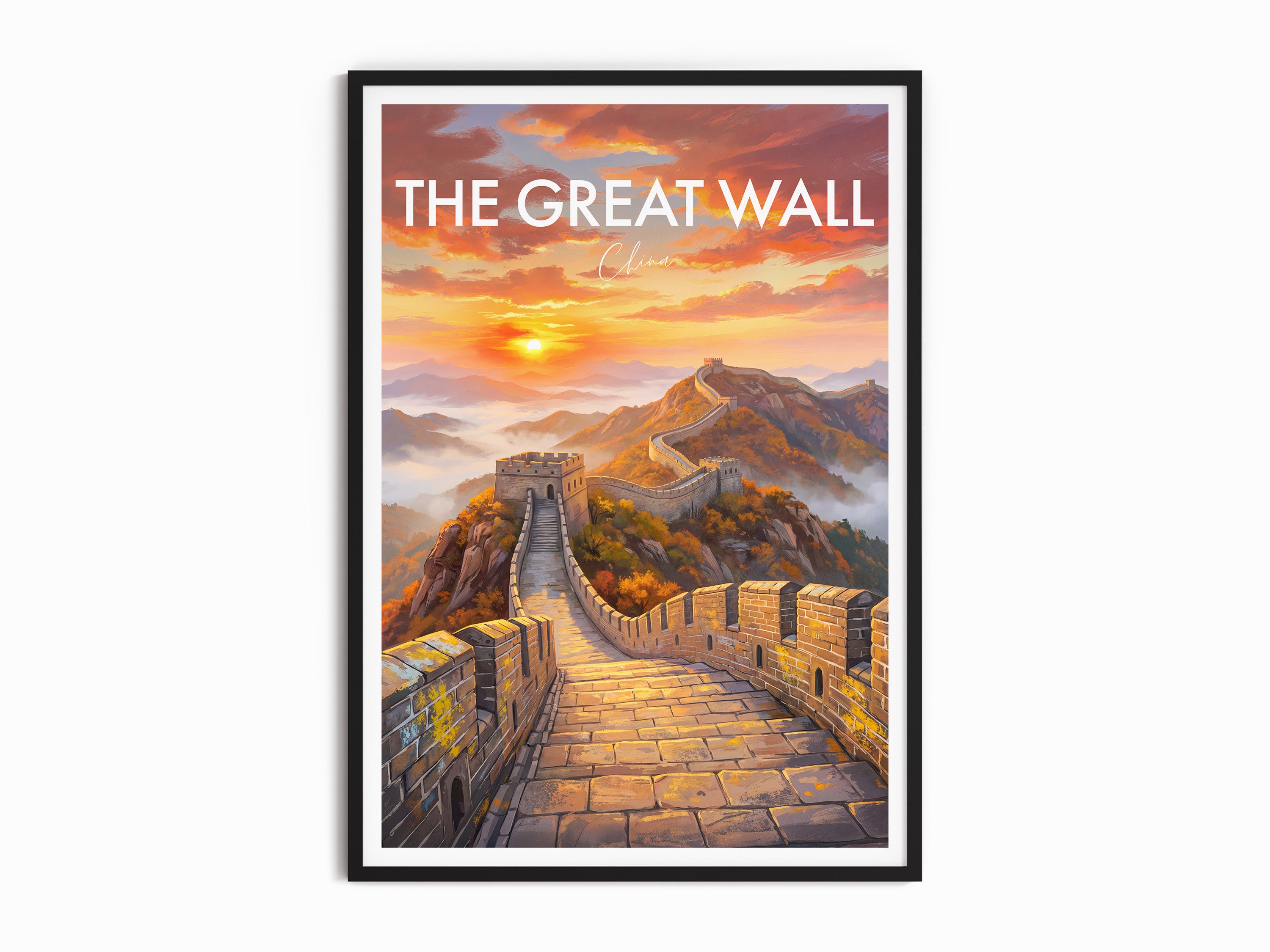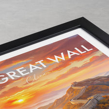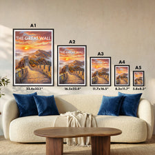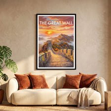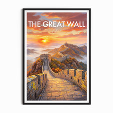 Capture the majesty of the Great Wall of China with this stunning travel poster featuring the iconic landscape at sunrise. This artwork brings the charm of China into your home, perfect for travel lovers or as a unique gift. Add history and inspiration to your wall decor with this beautiful Great Wall fine art print.