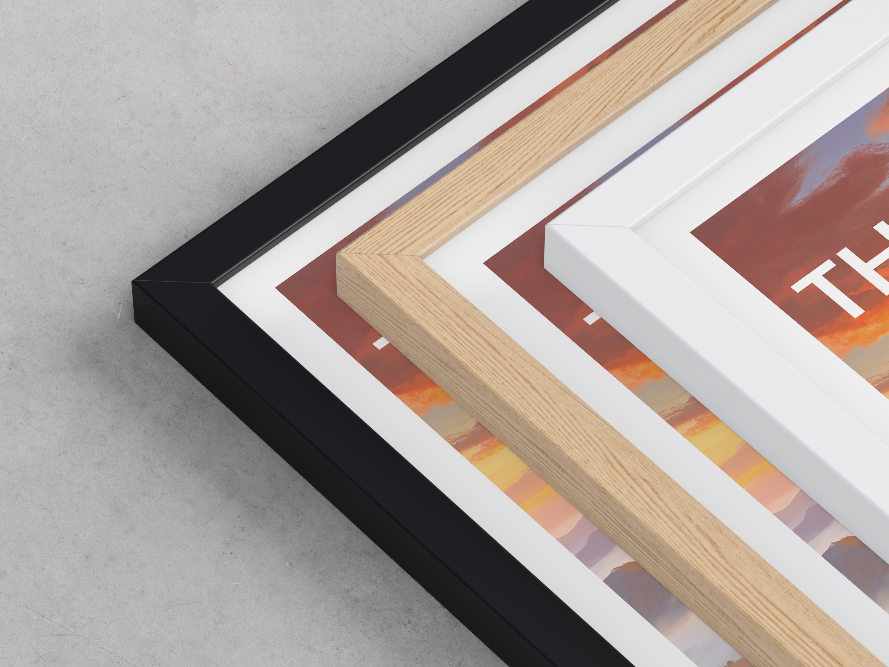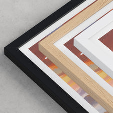 Framed options use sustainably sourced wooden frames in black, white, or natural wood, ready to hang.