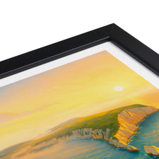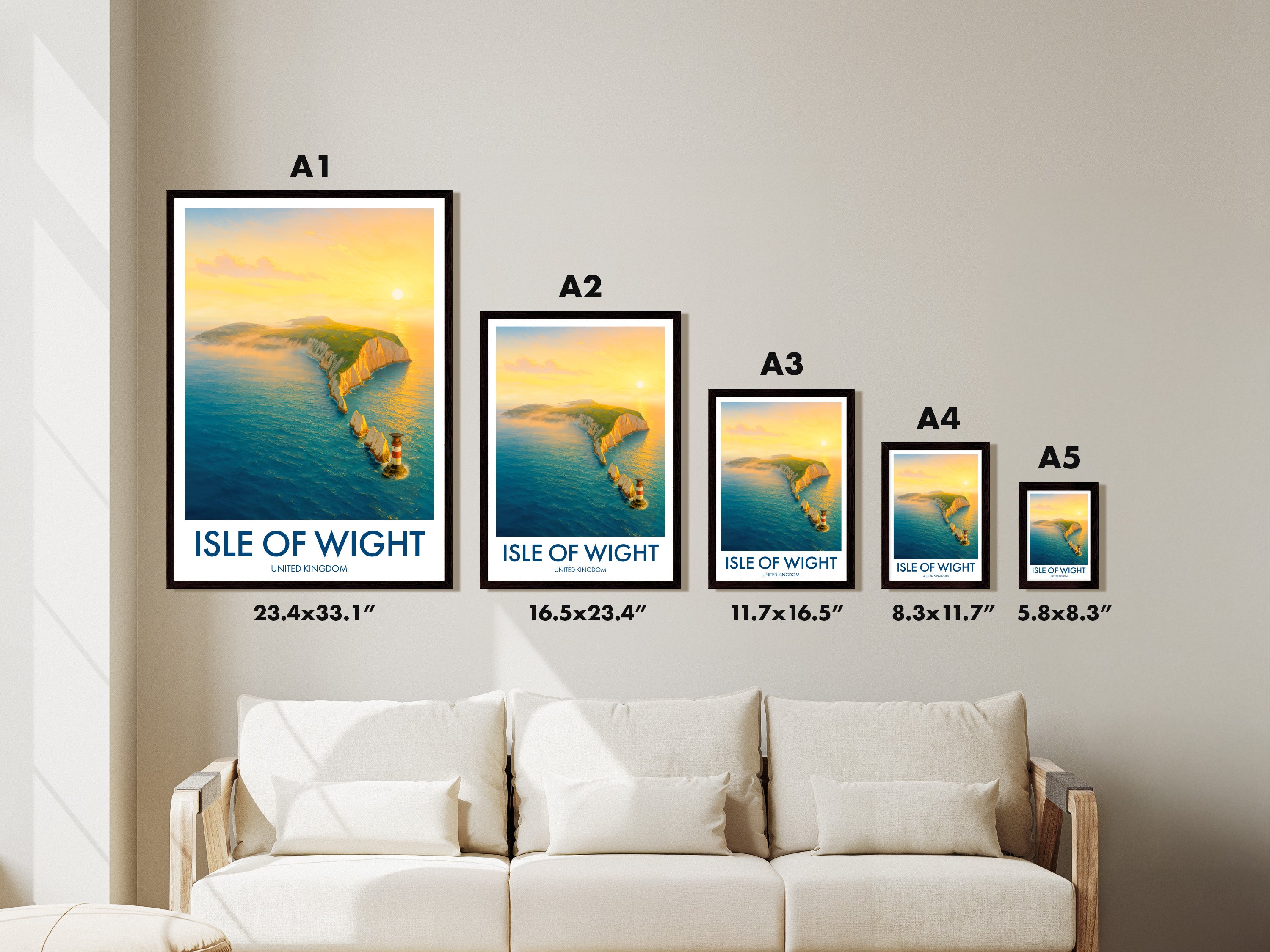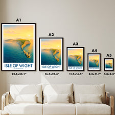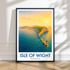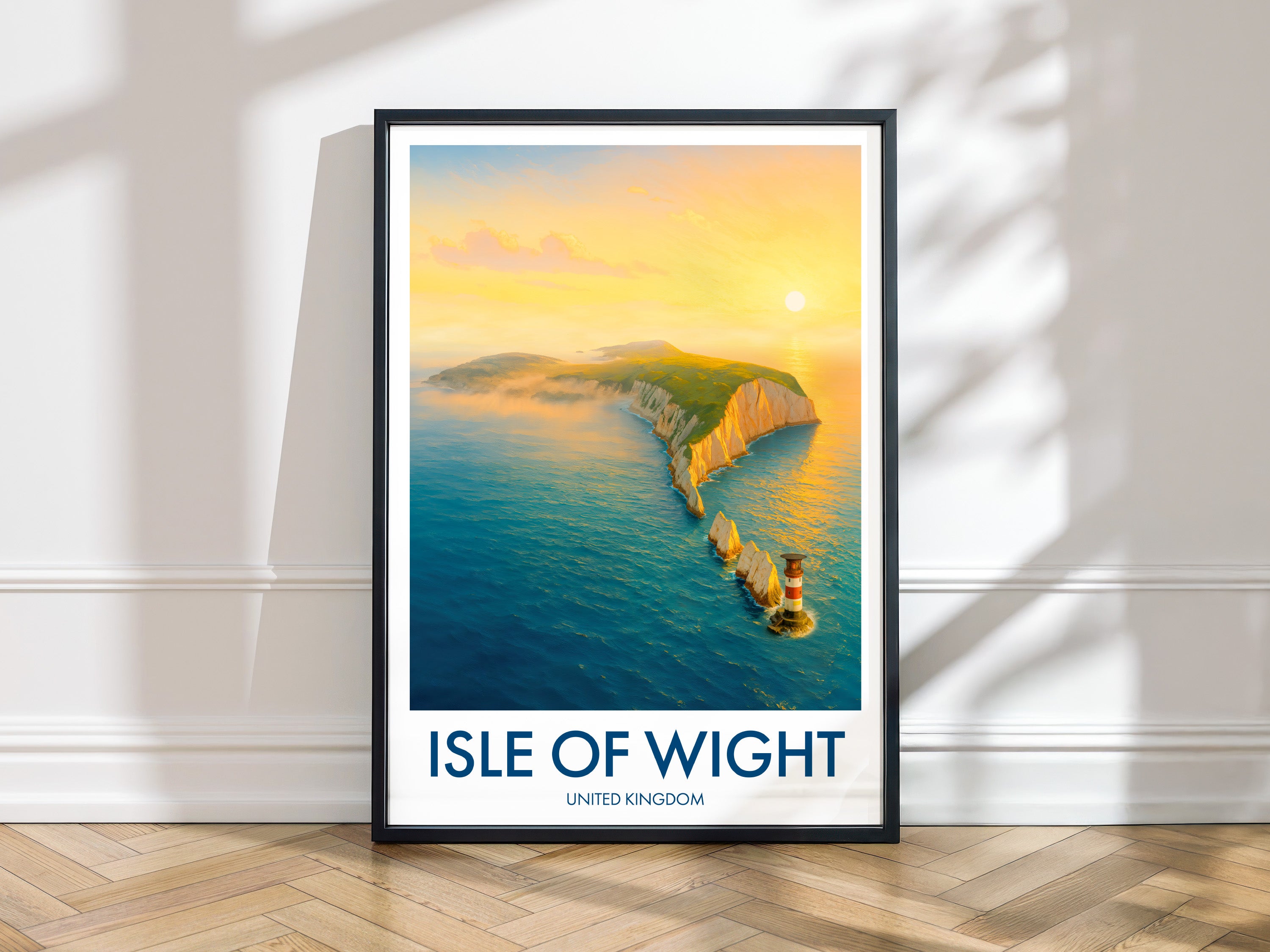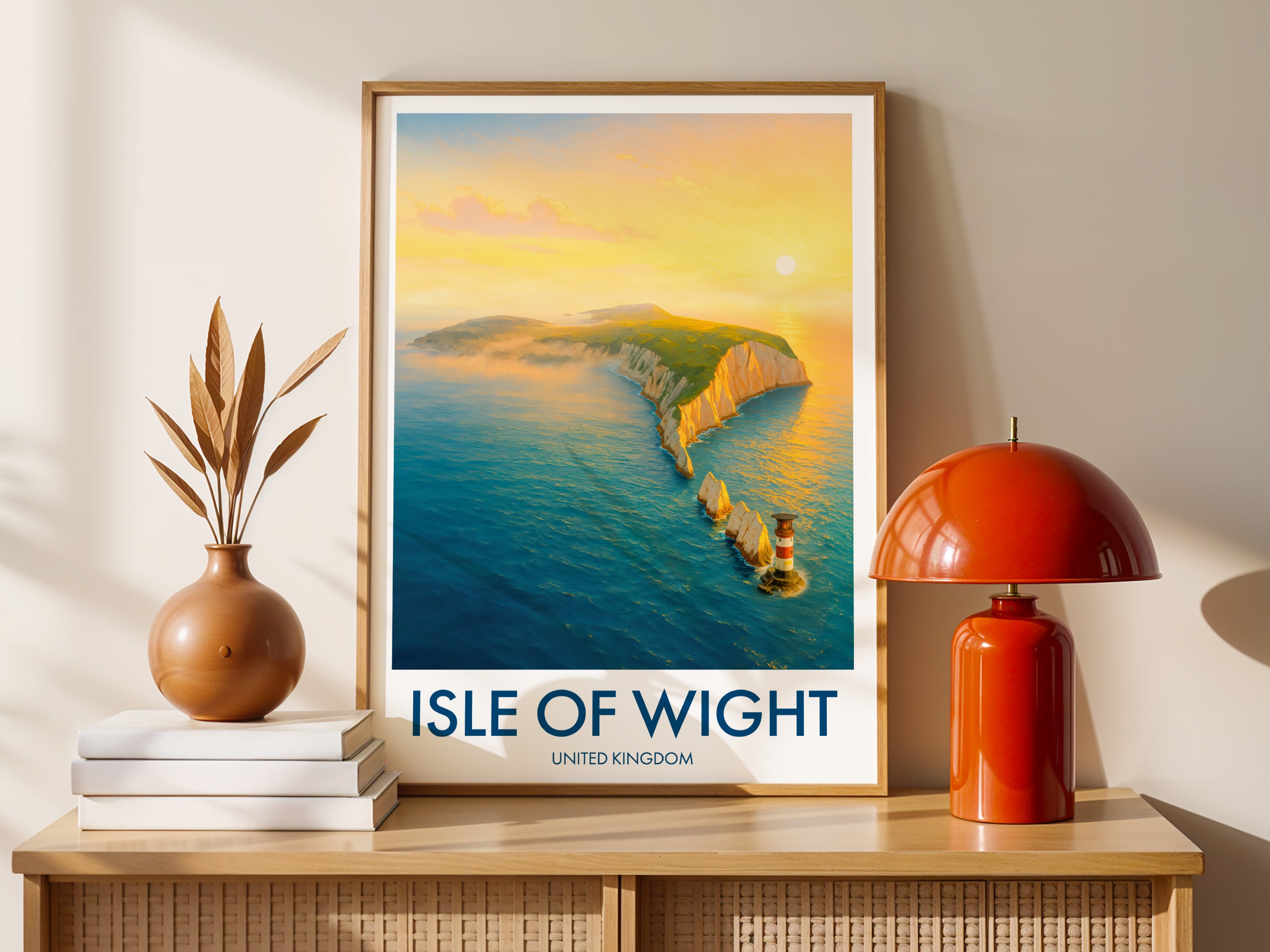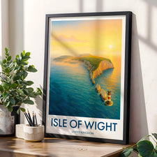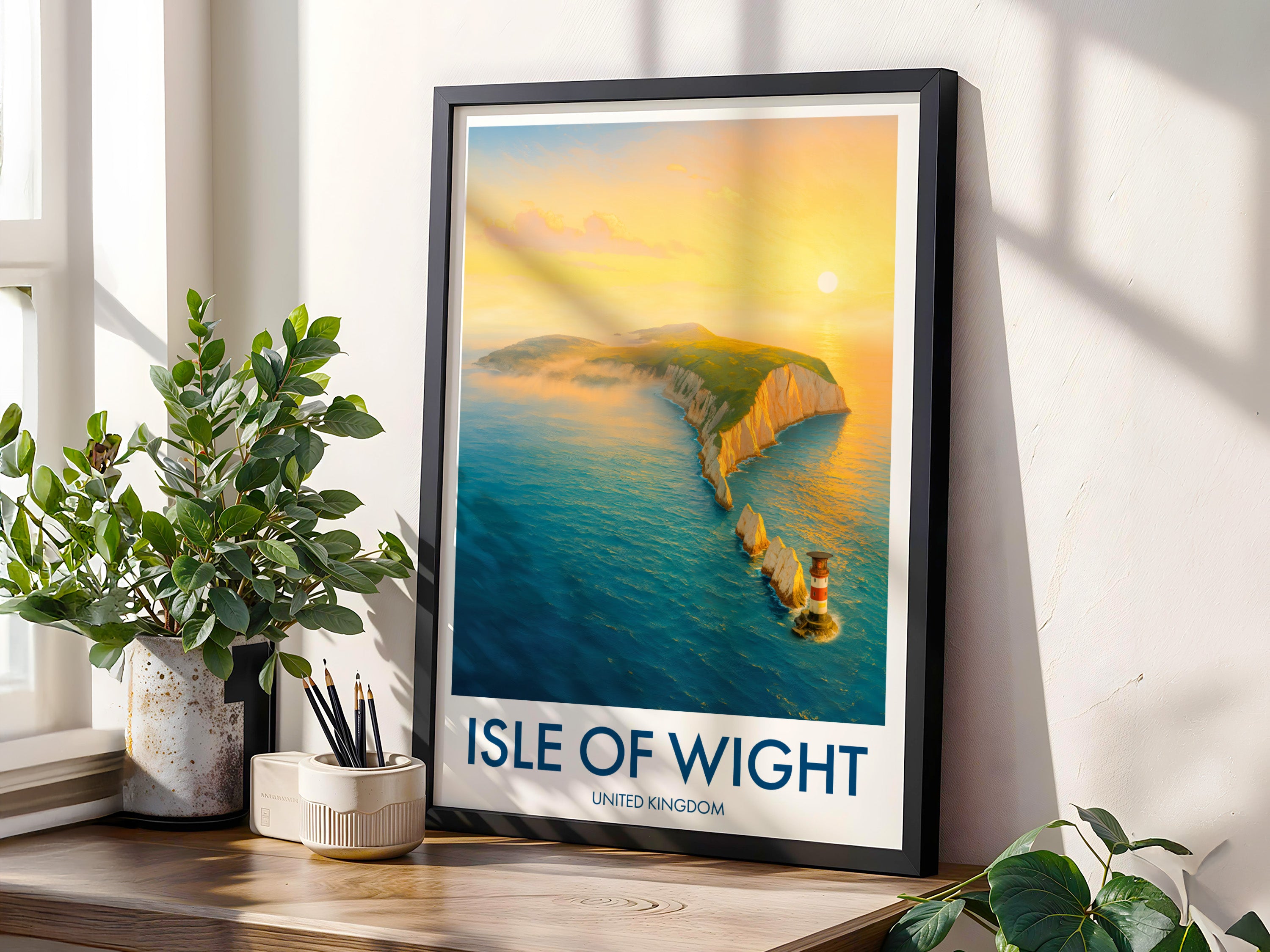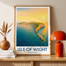 The Needles rise dramatically from the sea beside their iconic lighthouse, bathed in golden light. This illustrated print celebrates one of the Isle of Wight’s most famous landmarks.