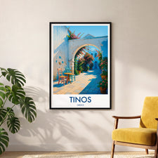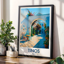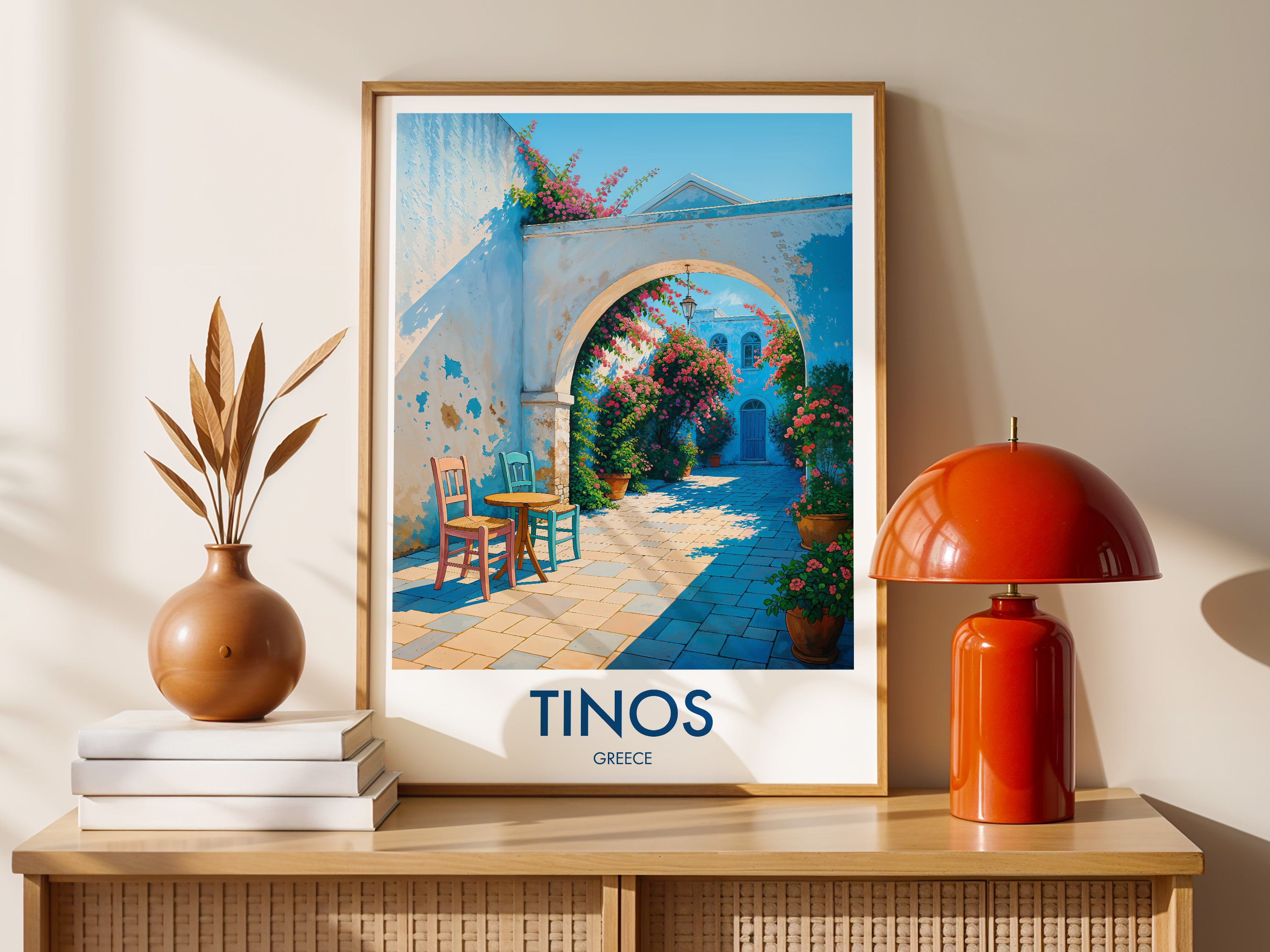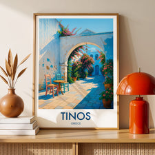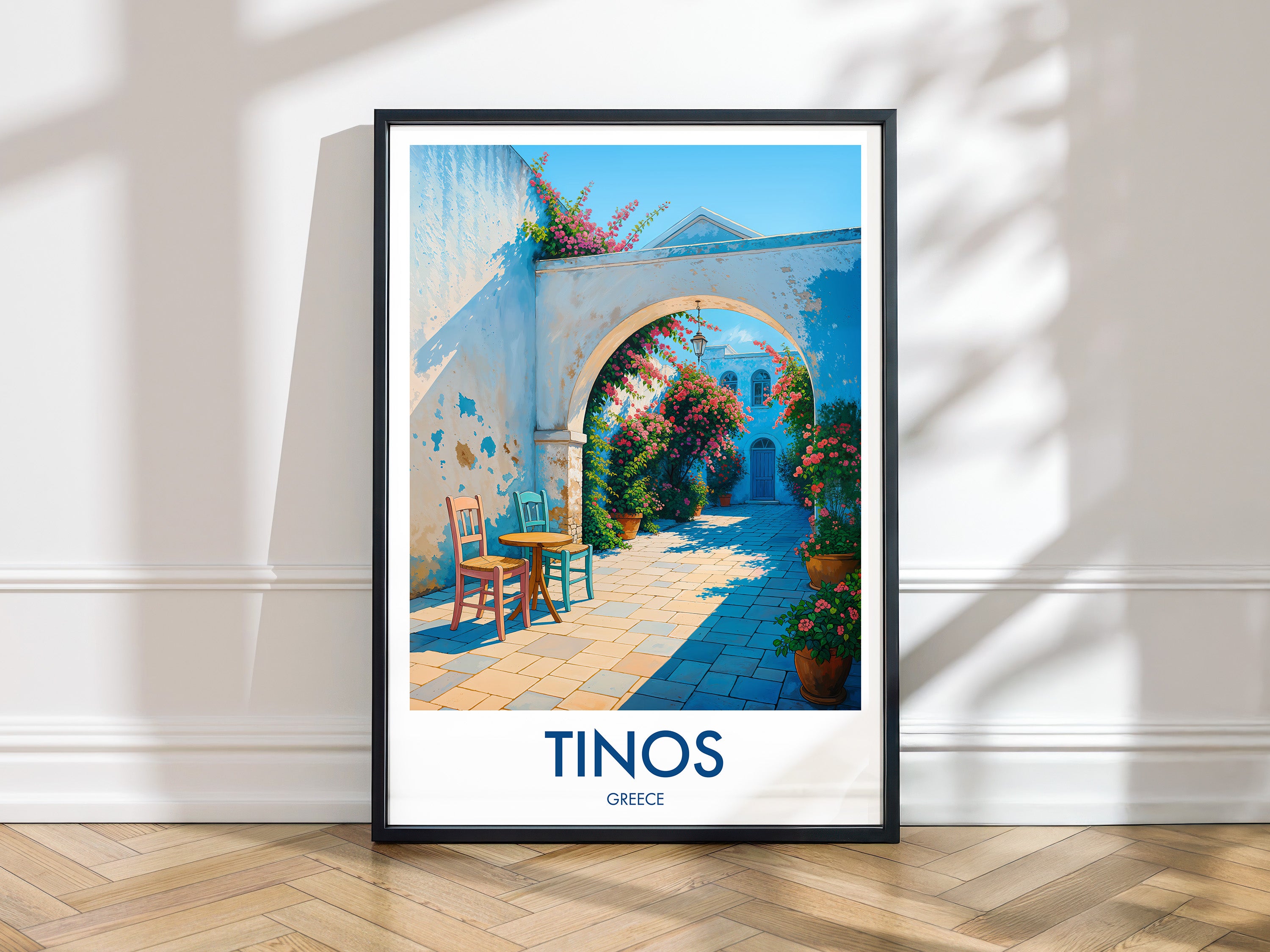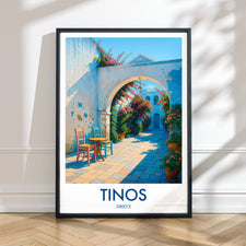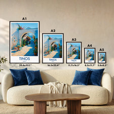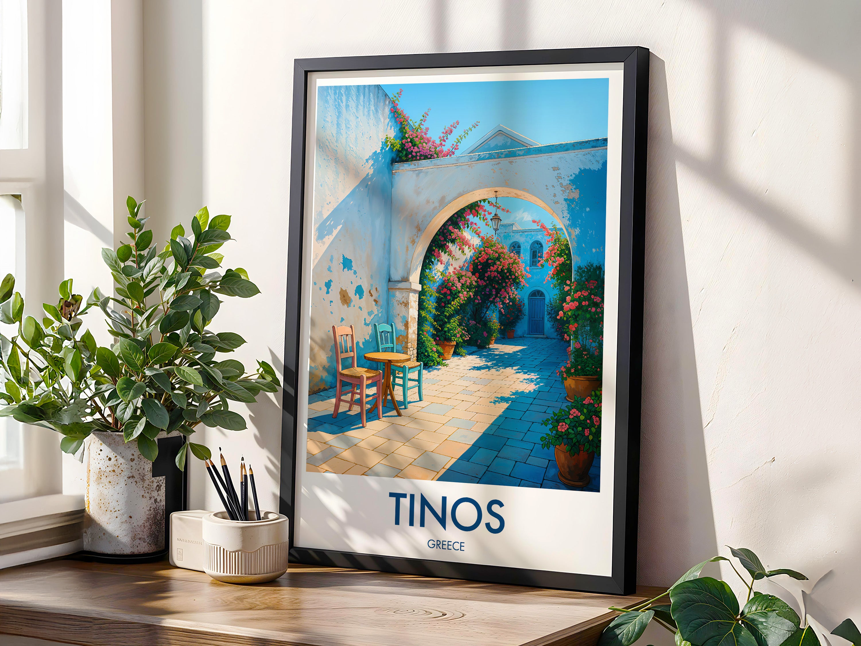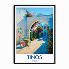 Capture the charm of Tinos Town with this beautifully illustrated print. Showcasing a quaint walkway adorned with vibrant flowers and vivid architecture, this piece brings a slice of Greek island life right into your home.
