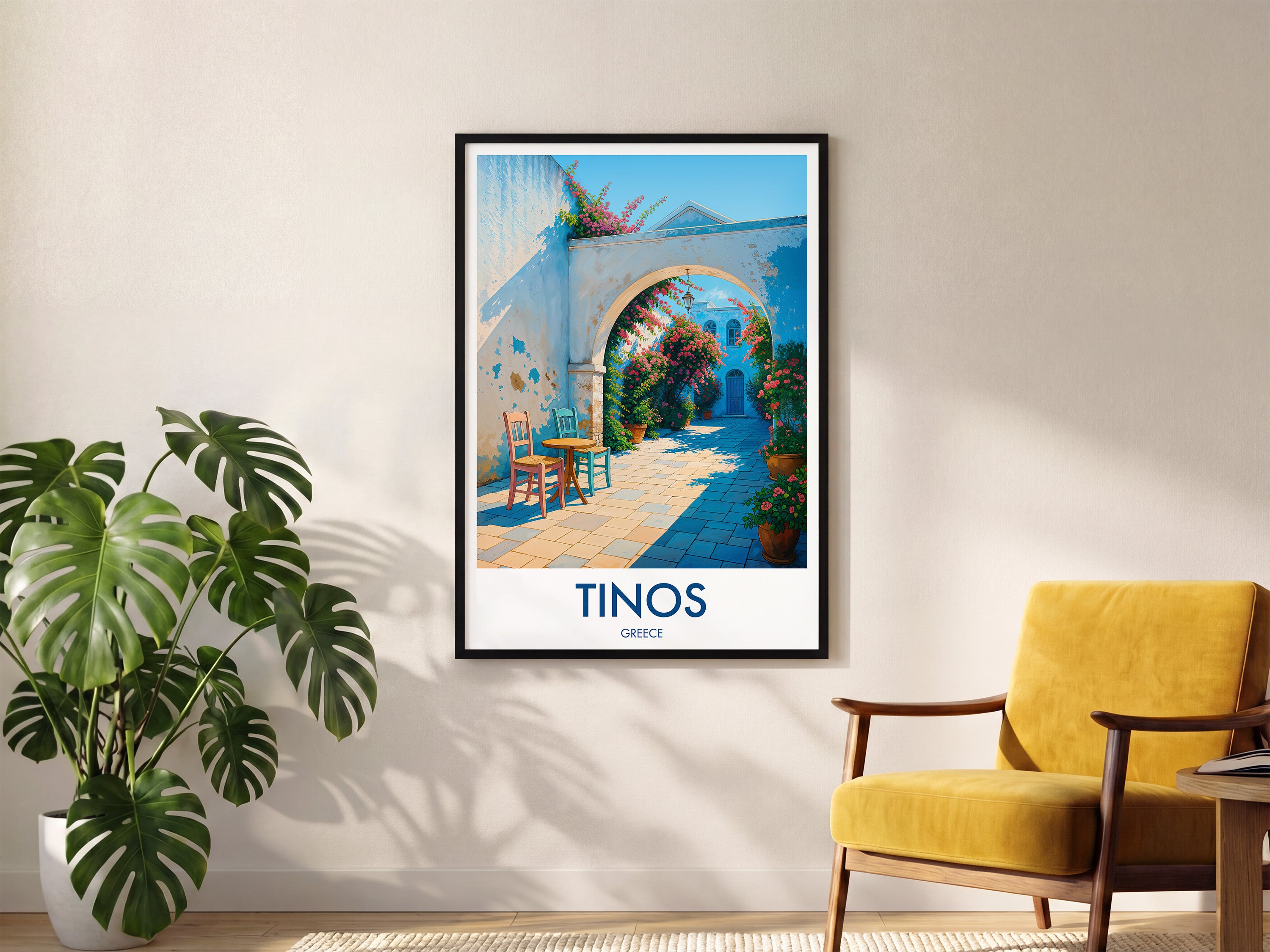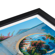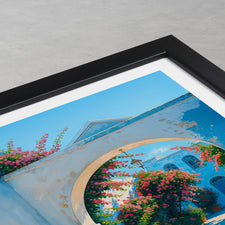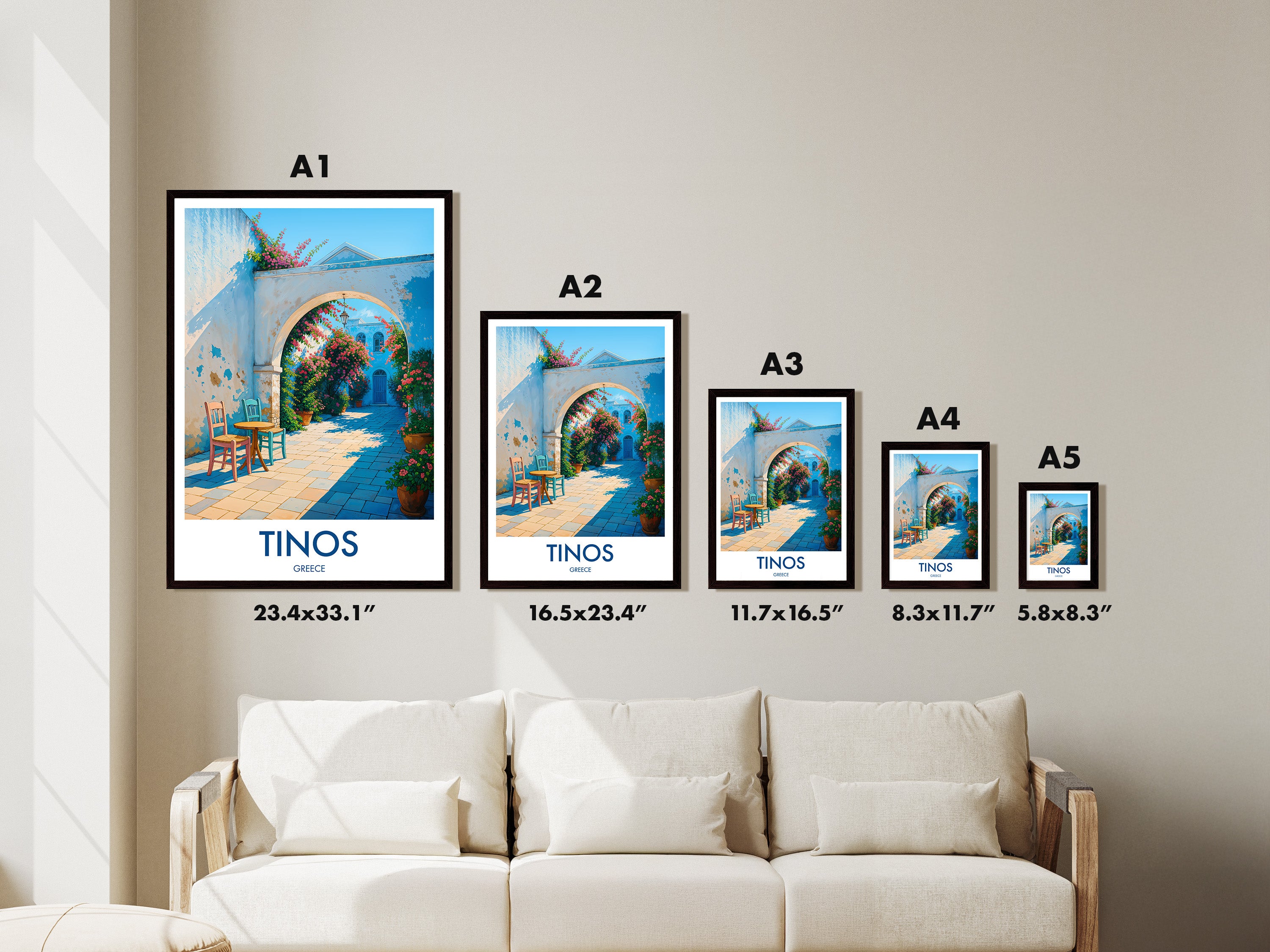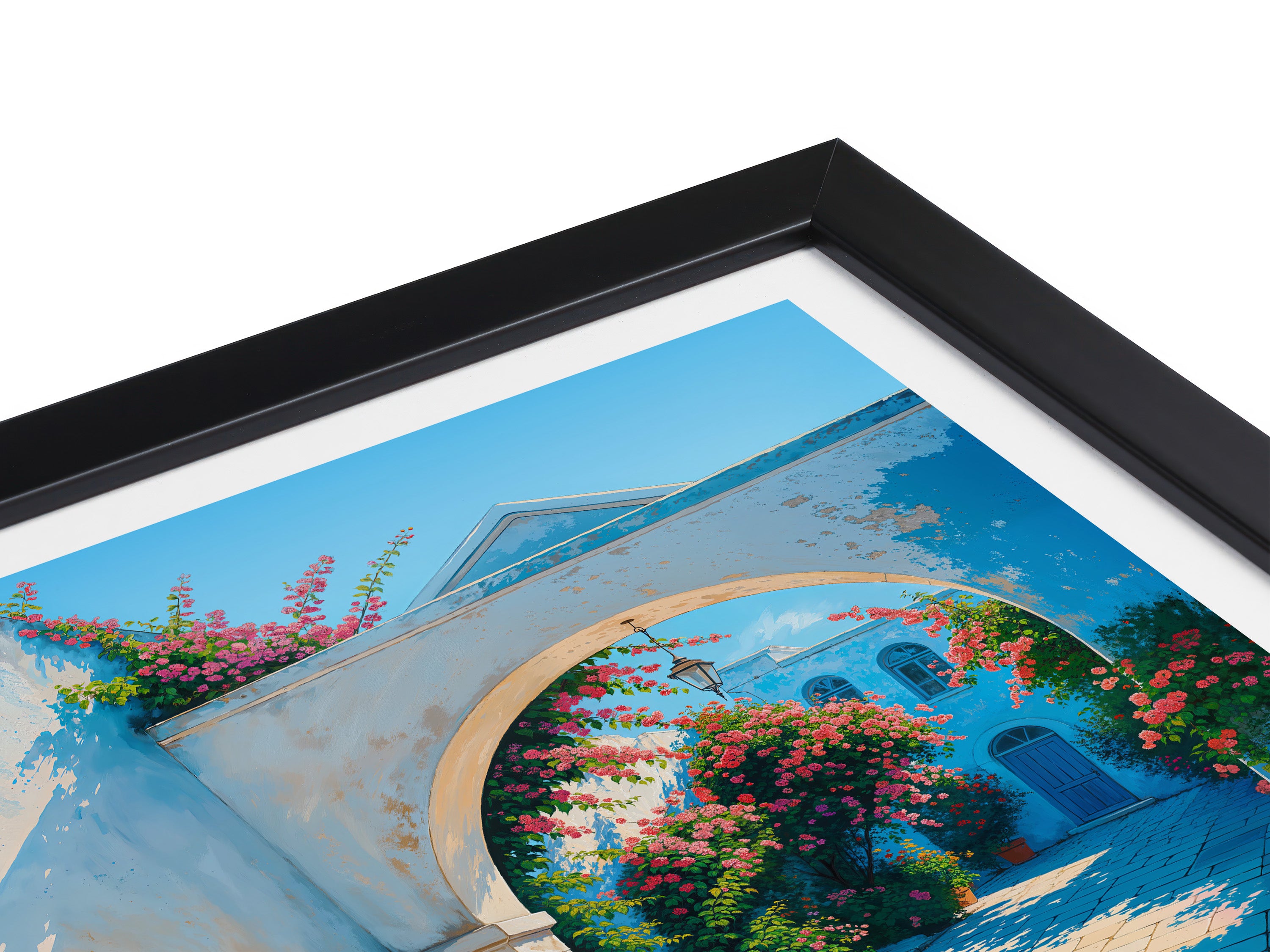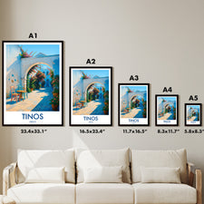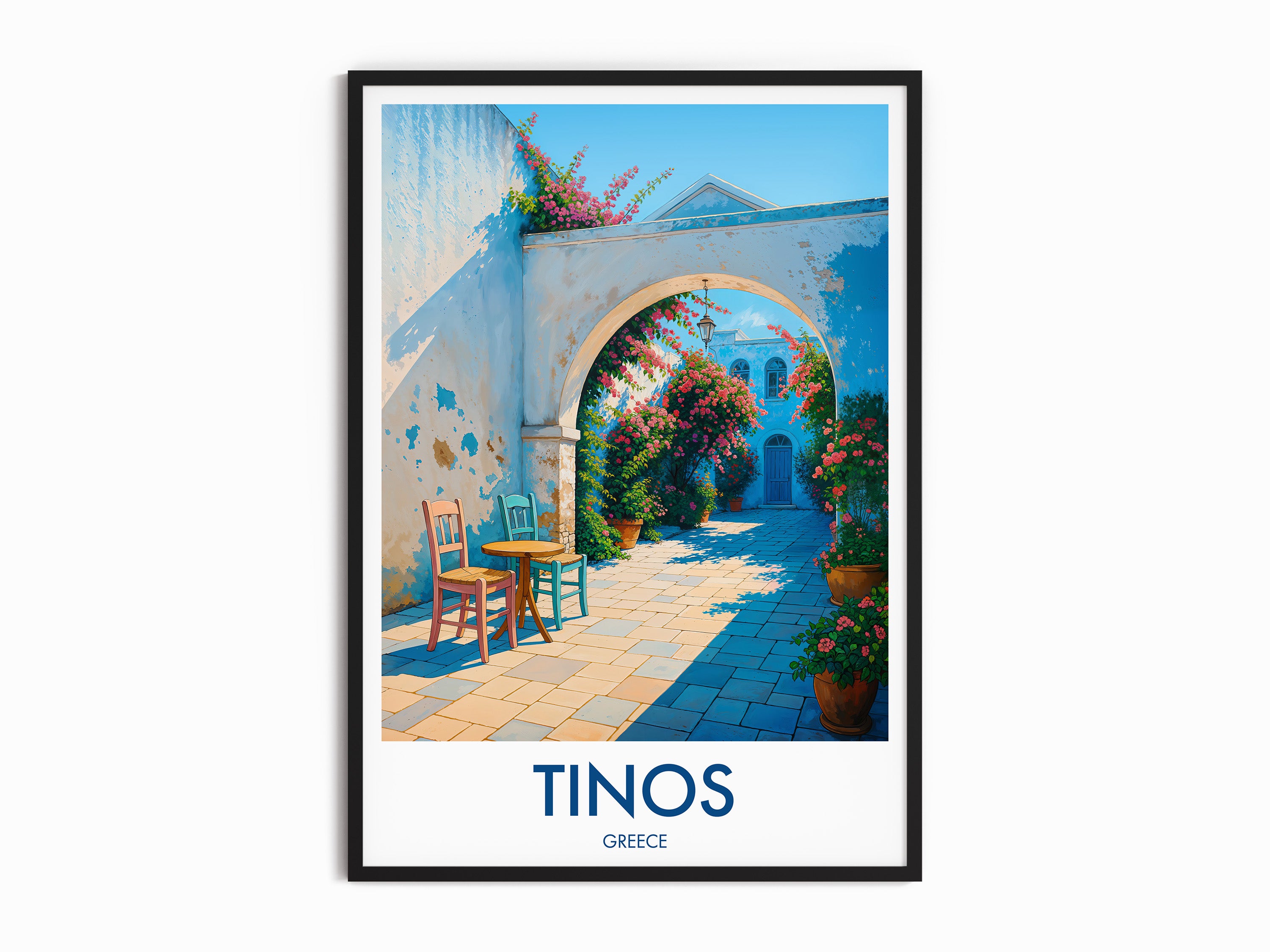Capture the charm of Tinos Town with this beautifully illustrated print. Showcasing a quaint walkway adorned with vibrant flowers and vivid architecture, this piece brings a slice of Greek island life right into your home.