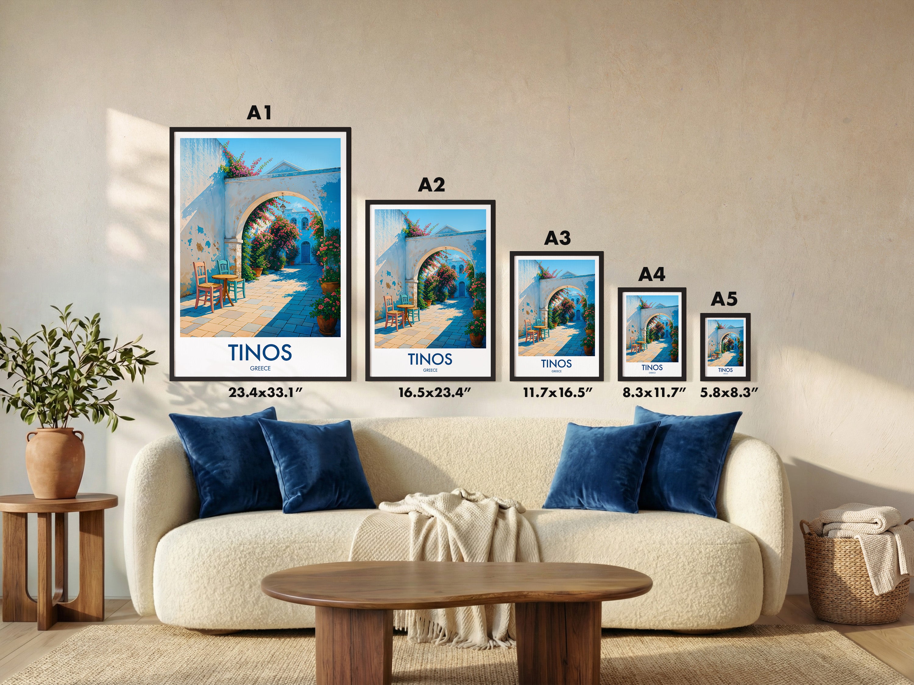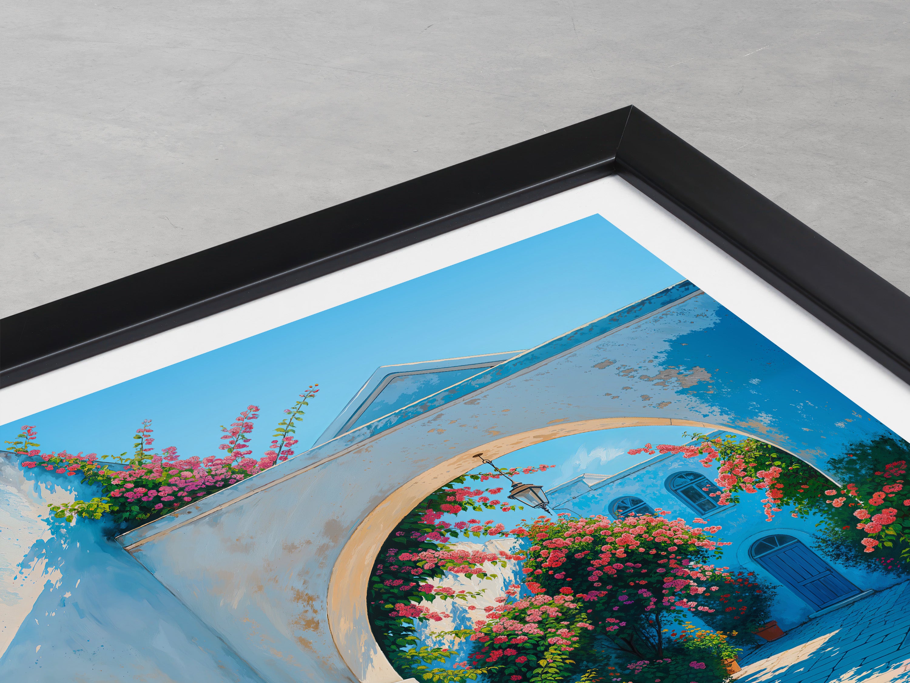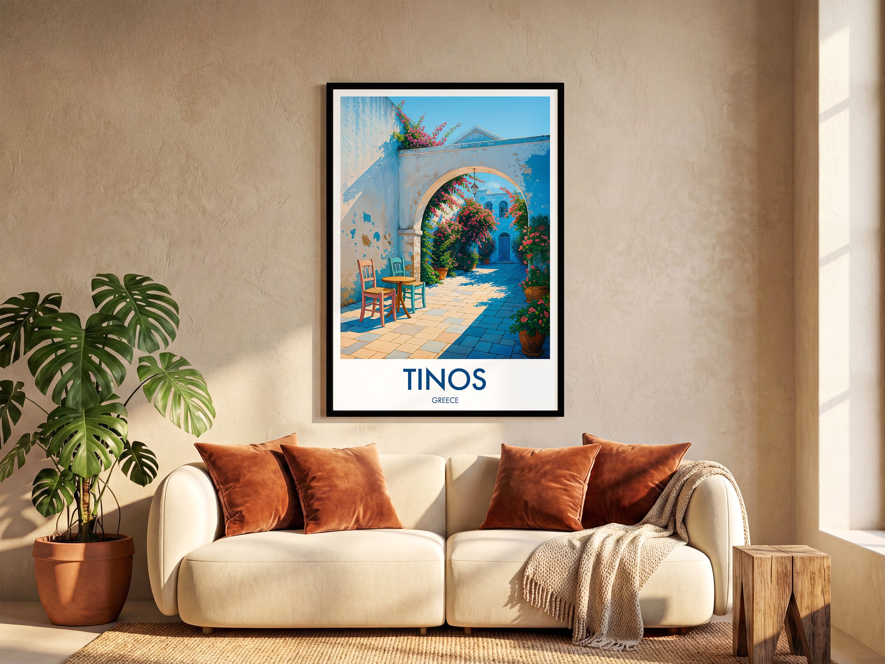 Capture the charm of Tinos Town with this beautifully illustrated print. Showcasing a quaint walkway adorned with vibrant flowers and vivid architecture, this piece brings a slice of Greek island life right into your home.