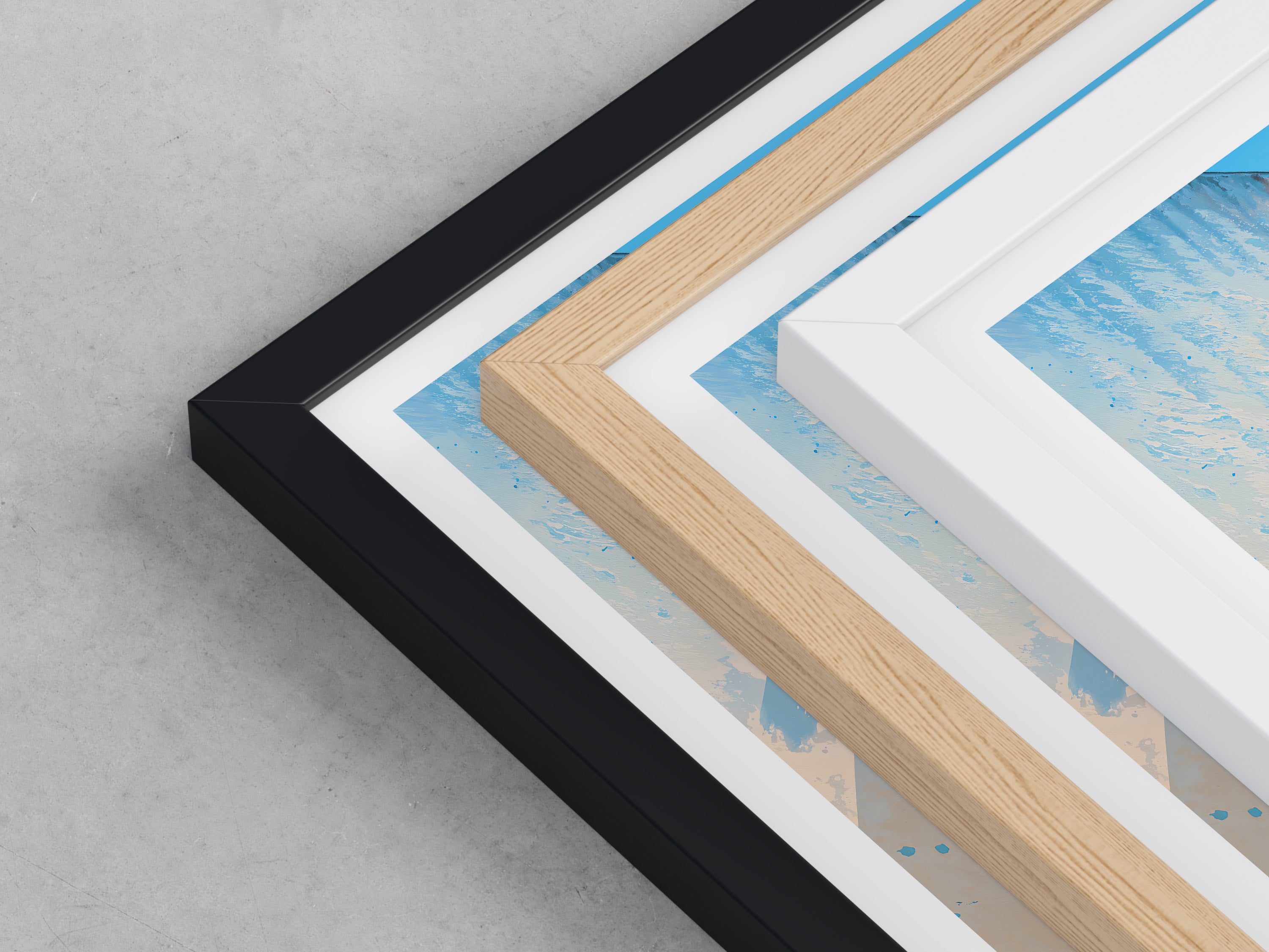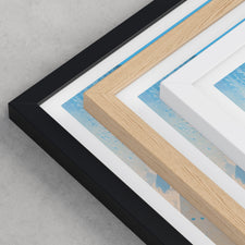 Framed options use sustainably sourced wooden frames in black, white, or natural wood, ready to hang.