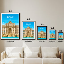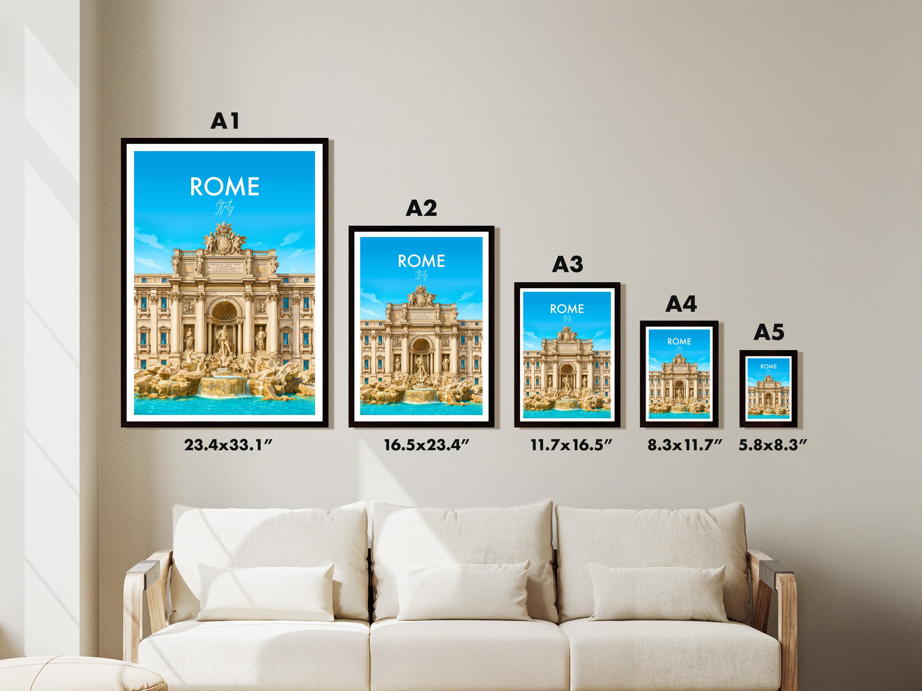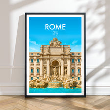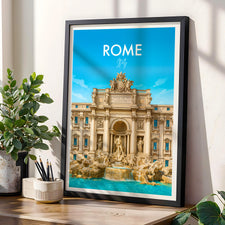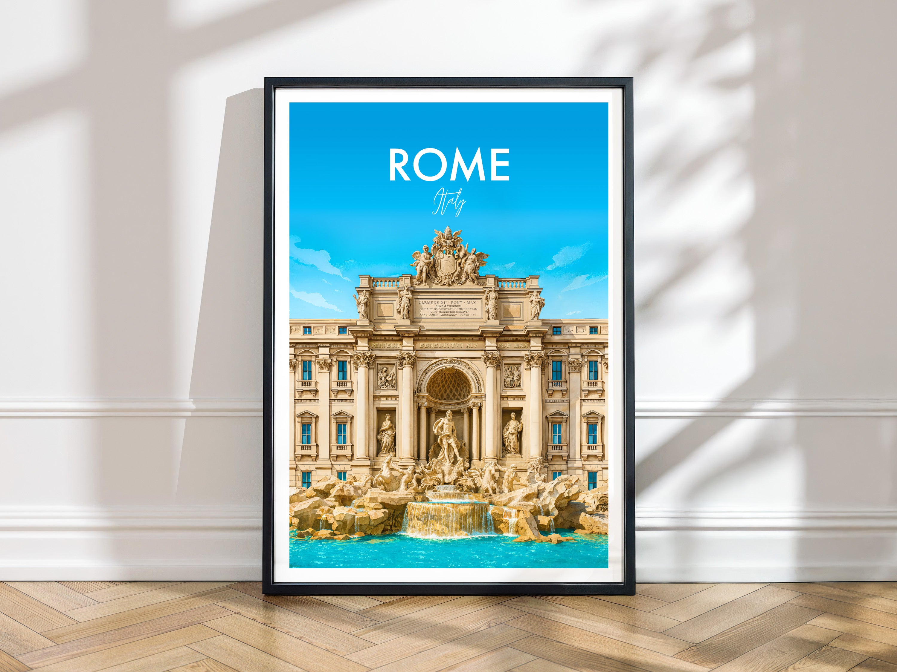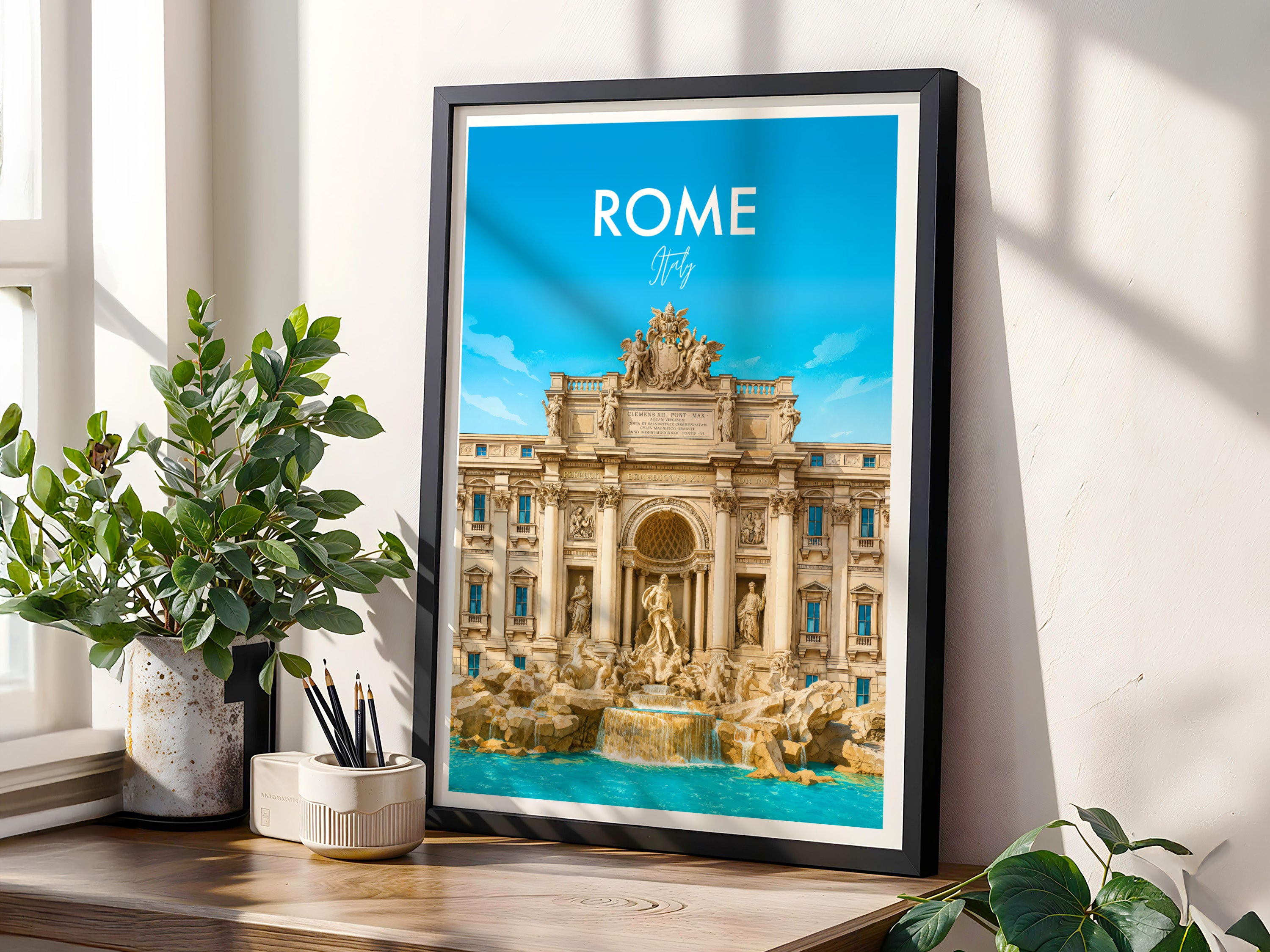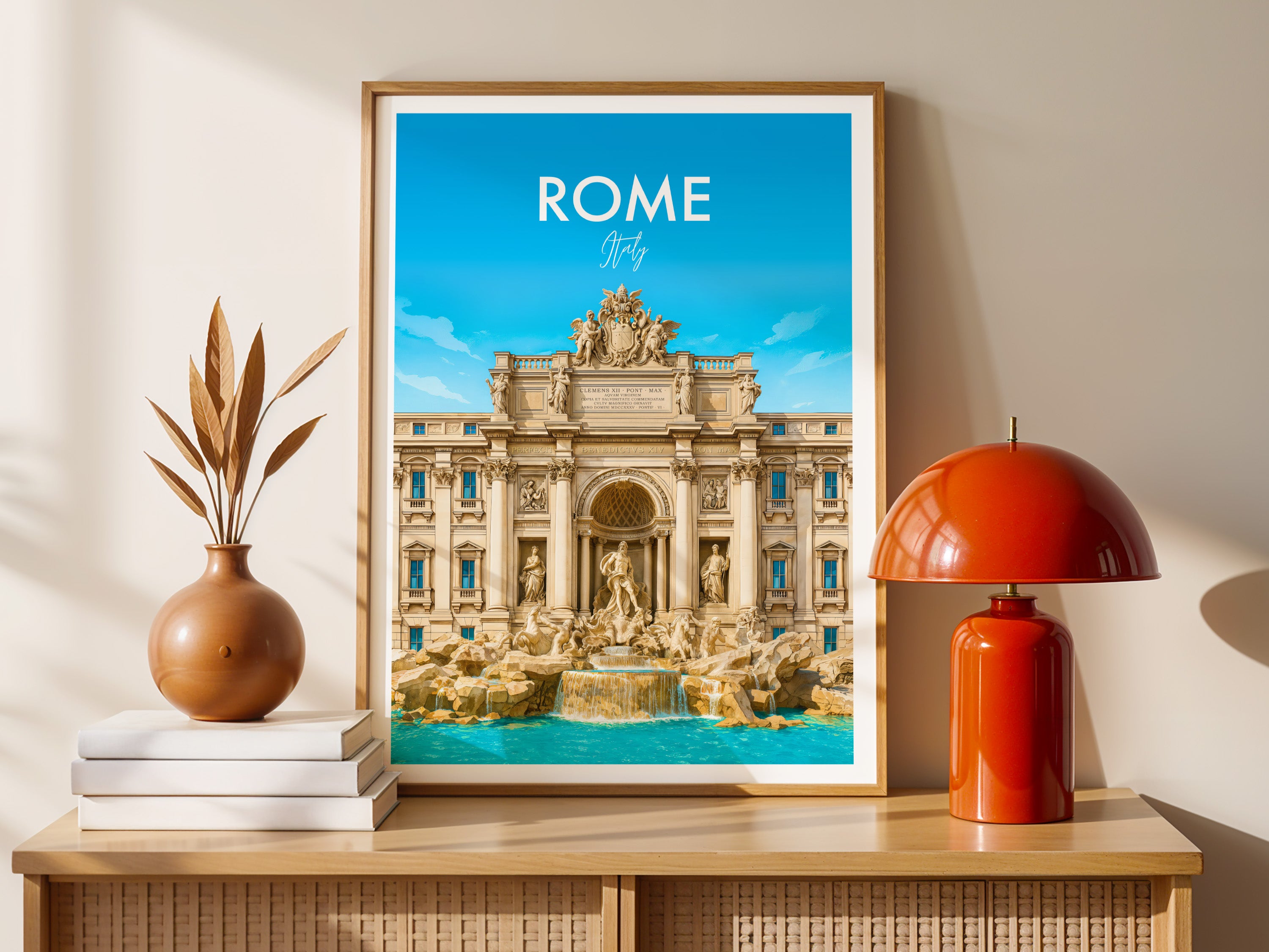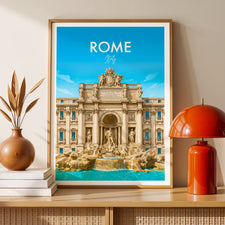 Capture the elegance of Rome with this beautiful print of the Trevi Fountain. Known for its baroque artistry and cultural significance, this piece adds historical charm to any space.