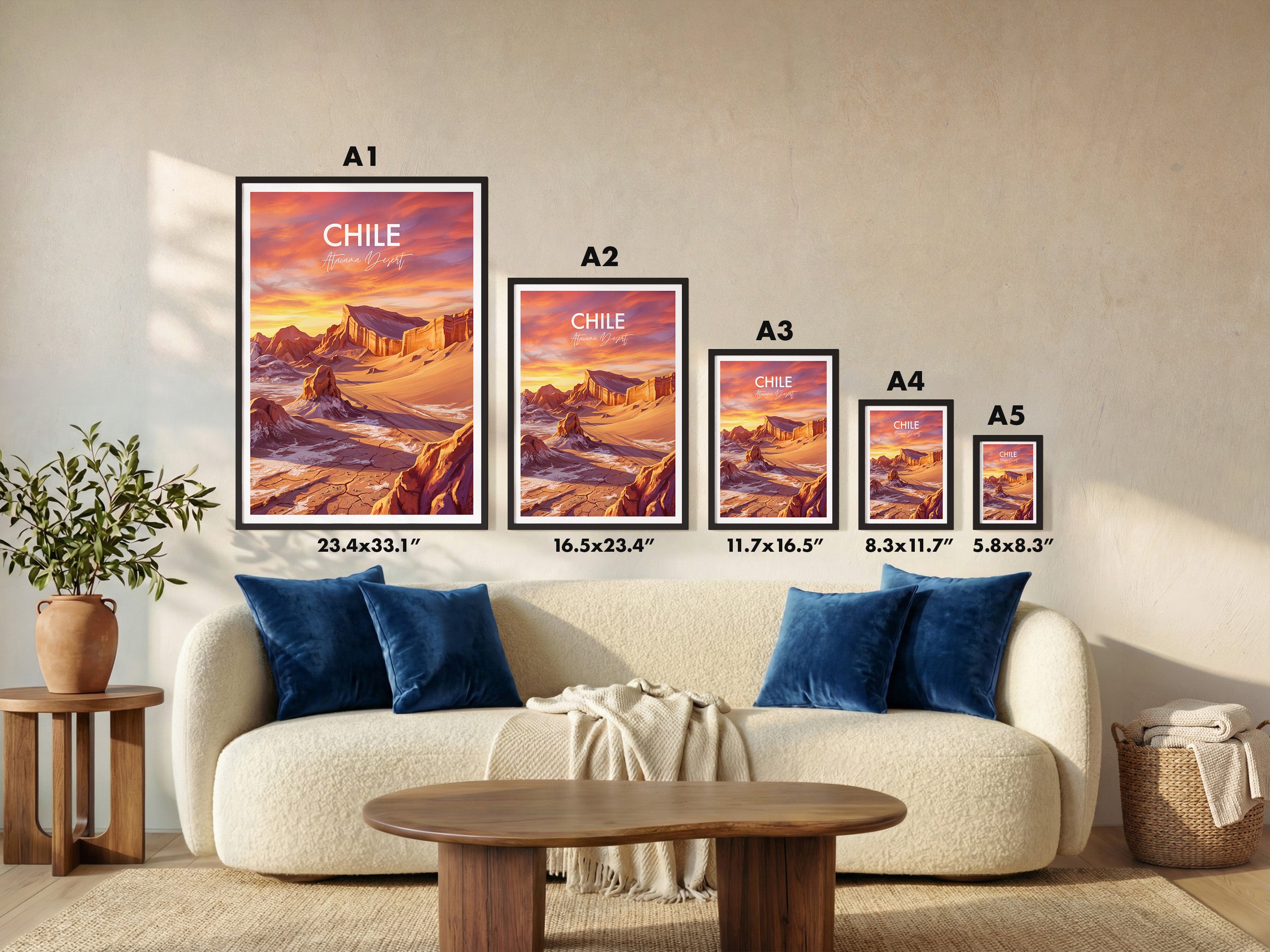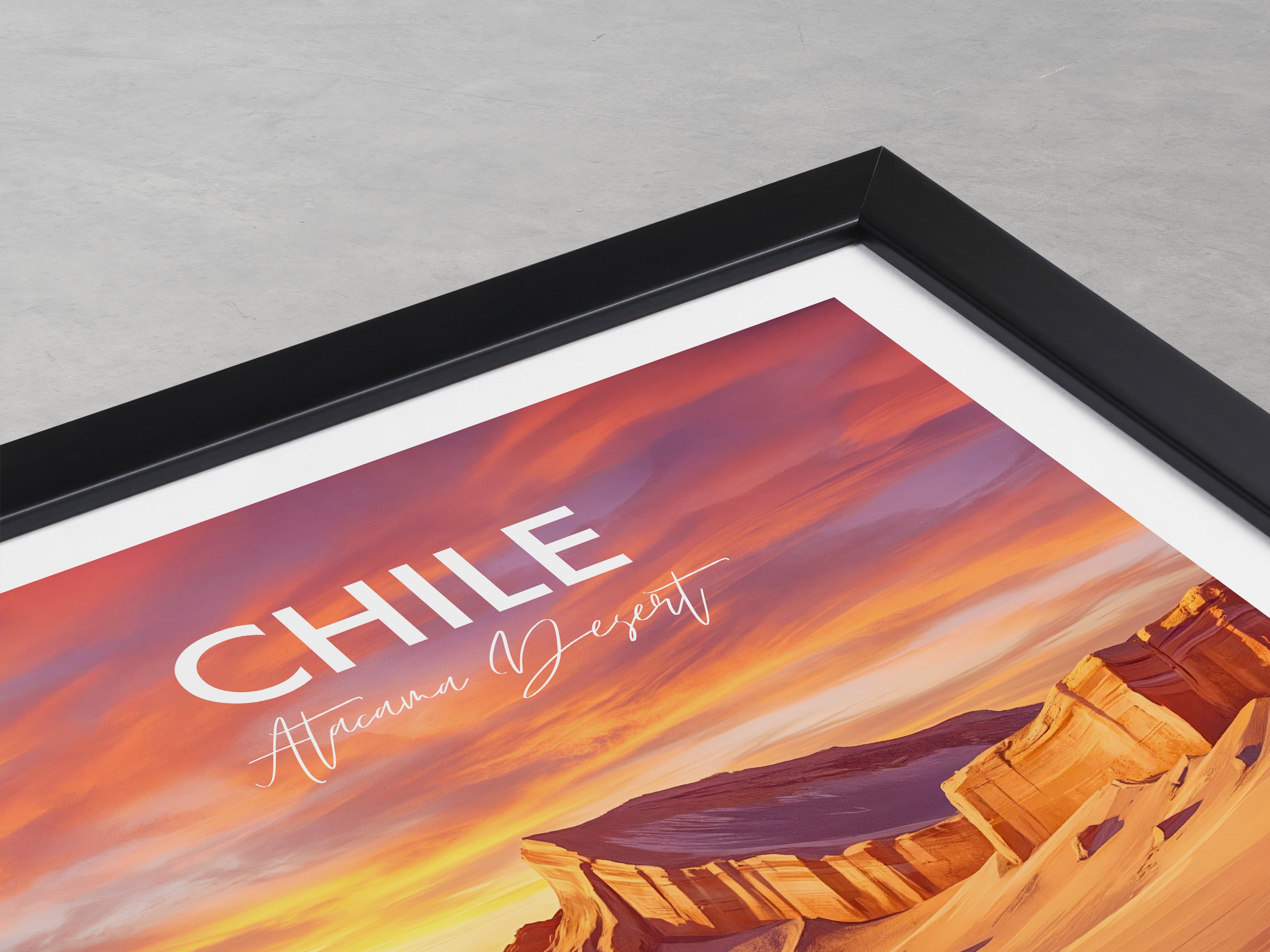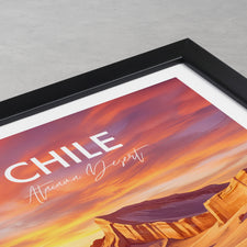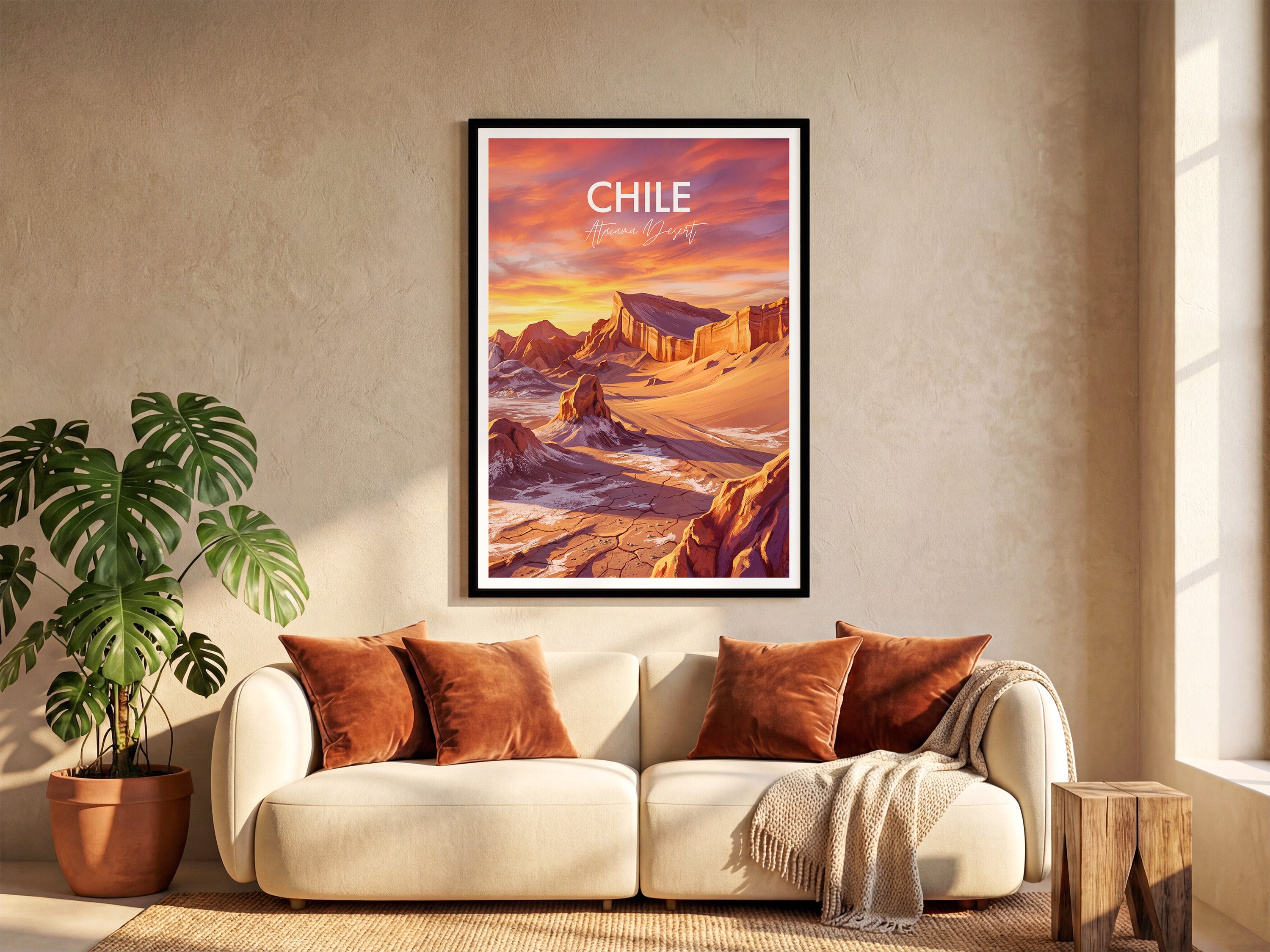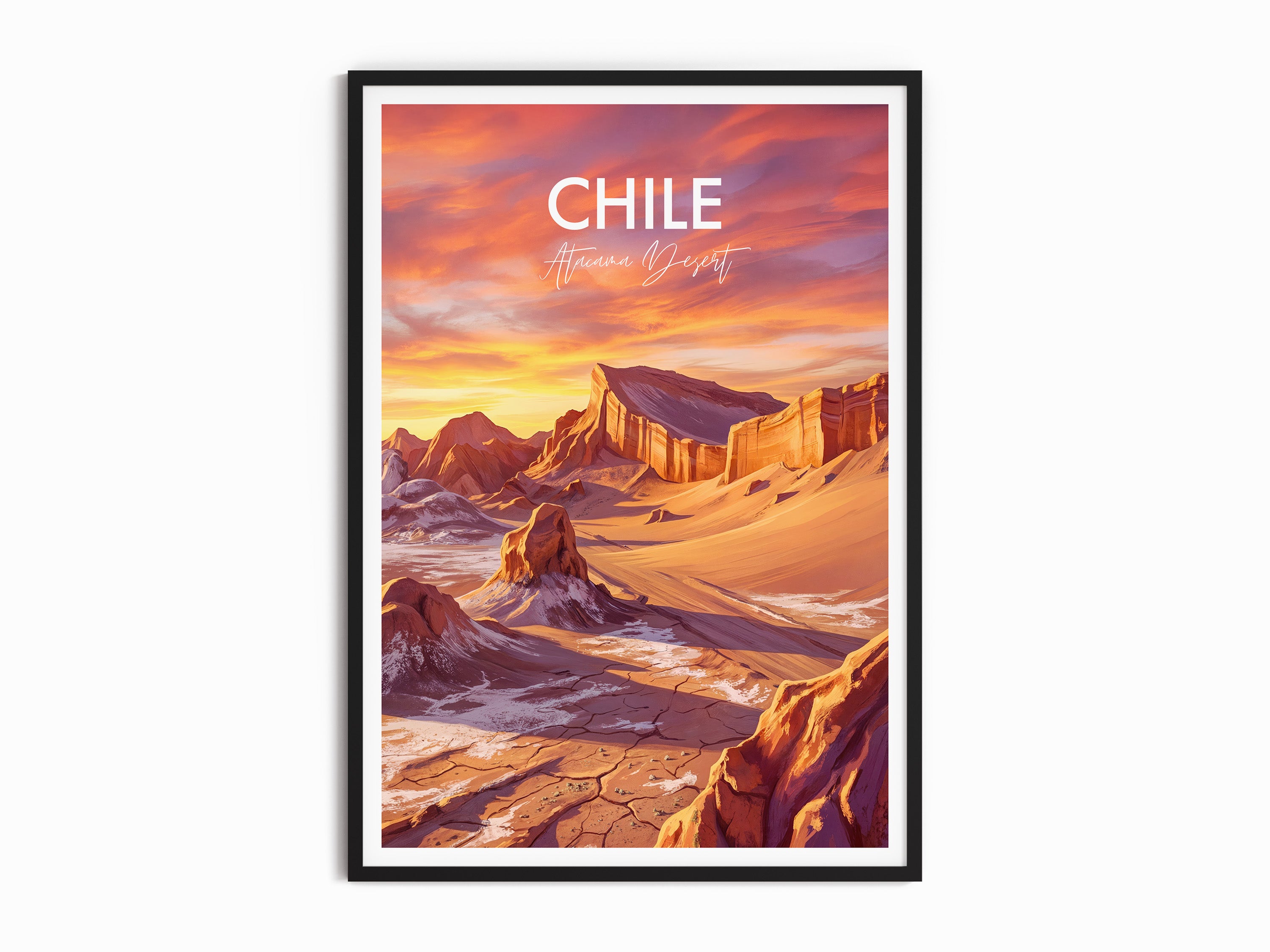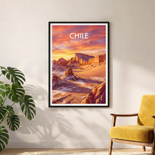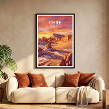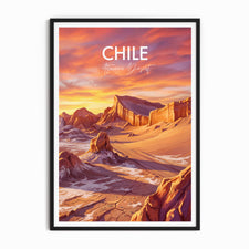 Bring home the striking beauty of Chile with this Valle de la Luna (Valley of the Moon) travel poster, capturing the Atacama Desert’s dramatic landscapes. The vibrant print transports you to Chile’s famous Valle de la Luna with its otherworldly rocks and sweeping sands, perfect wall decor for adventurers or unique gift seekers.