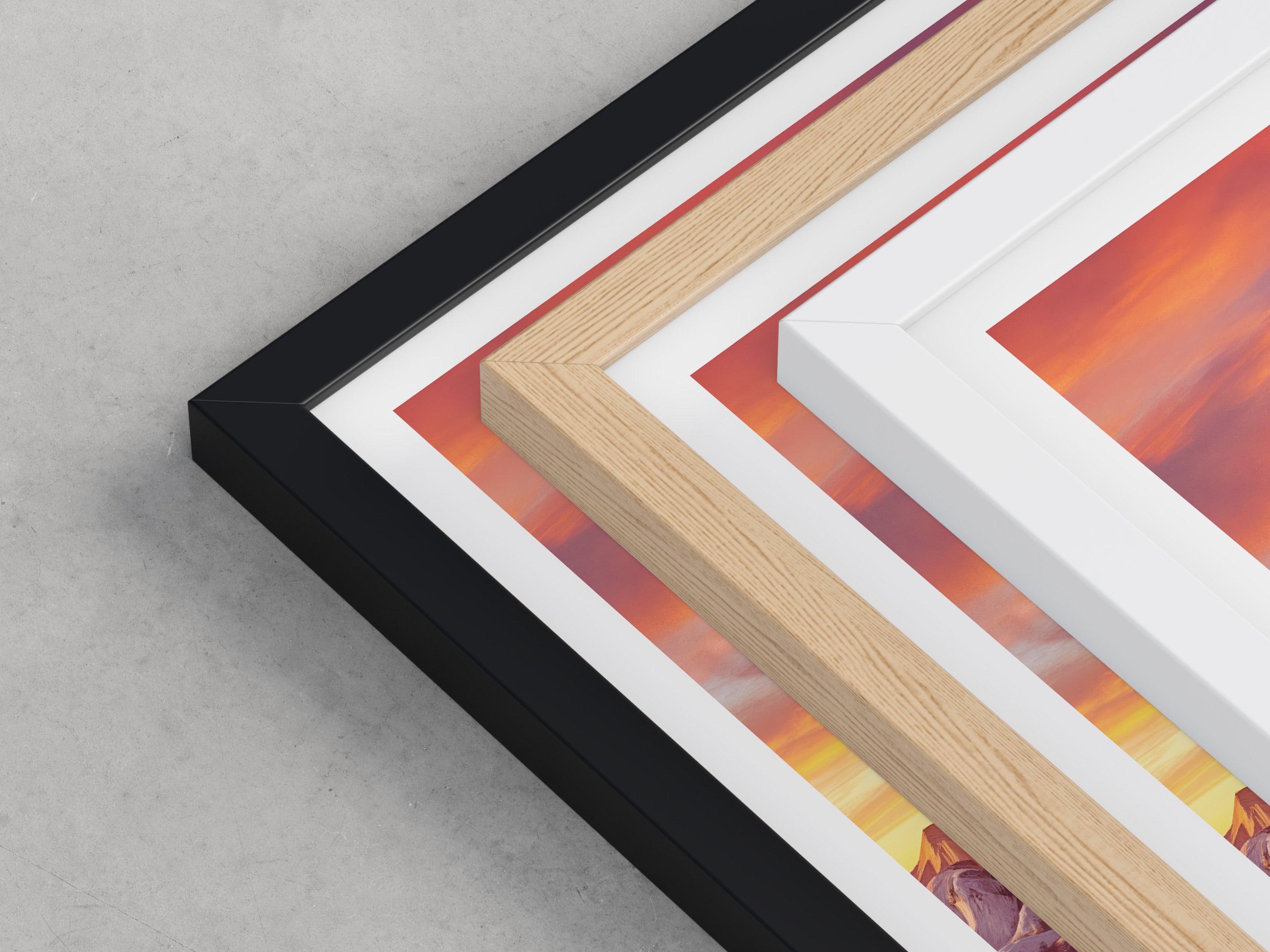Framed options use sustainably sourced wooden frames in black, white, or natural wood, ready to hang.