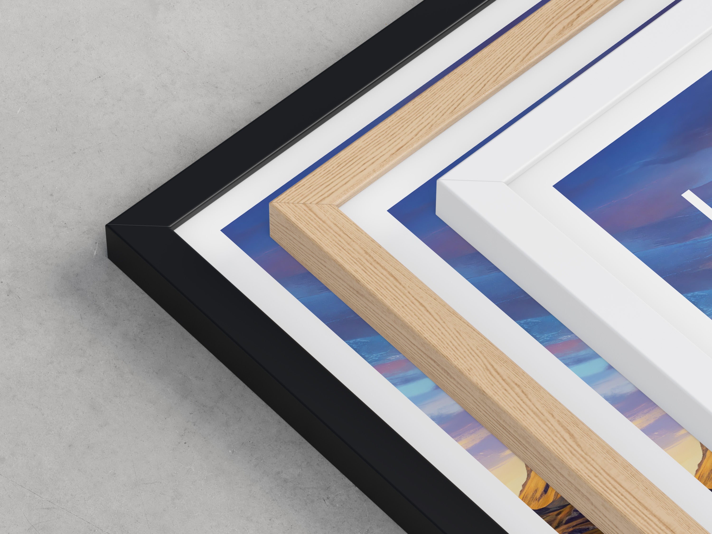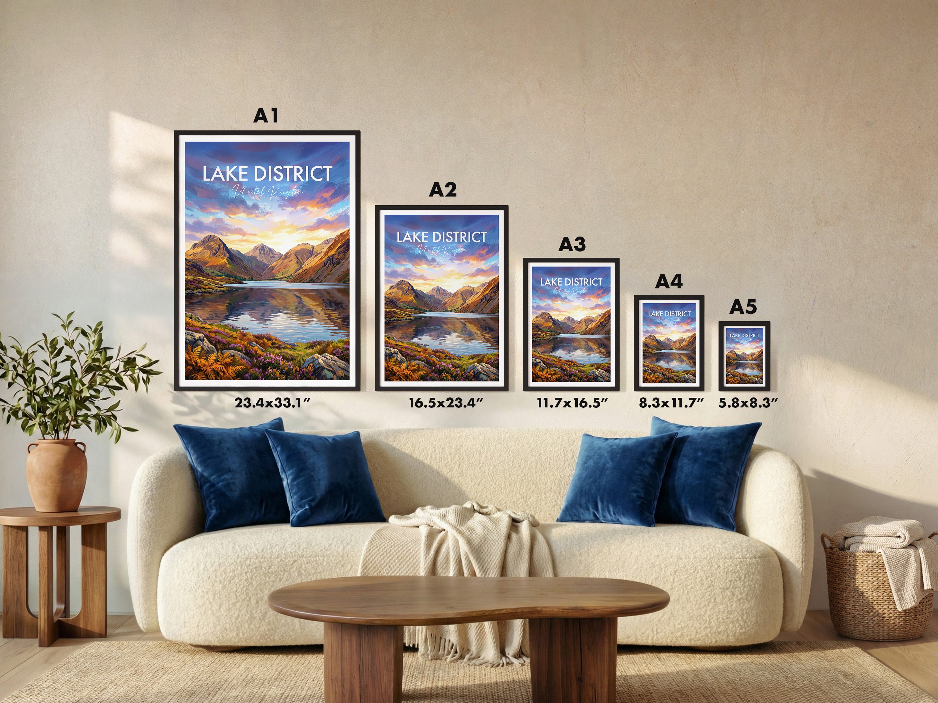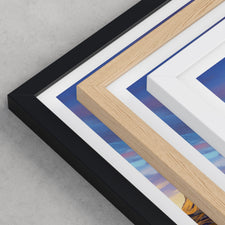 Framed options use sustainably sourced wooden frames in black, white, or natural wood, ready to hang.