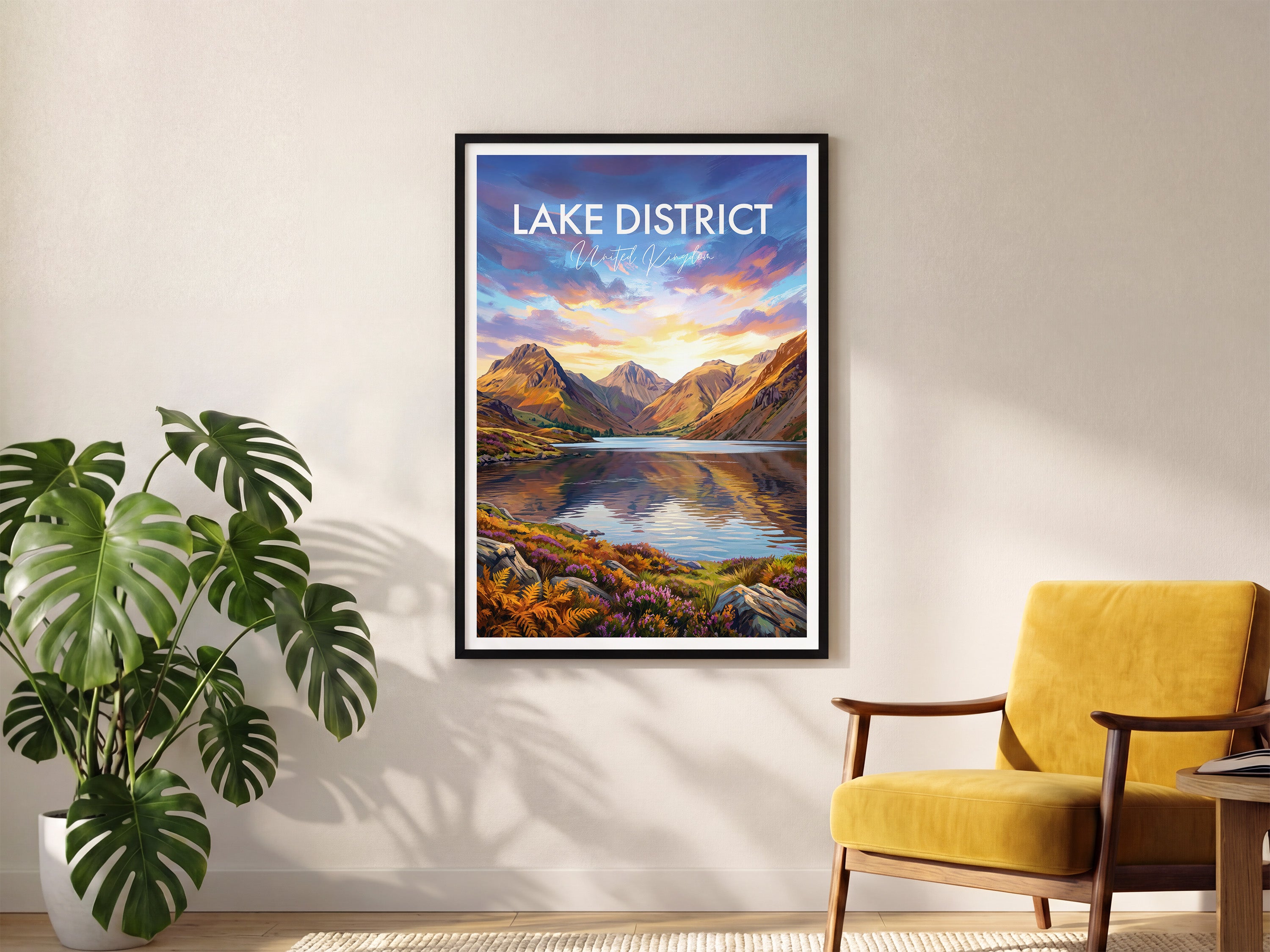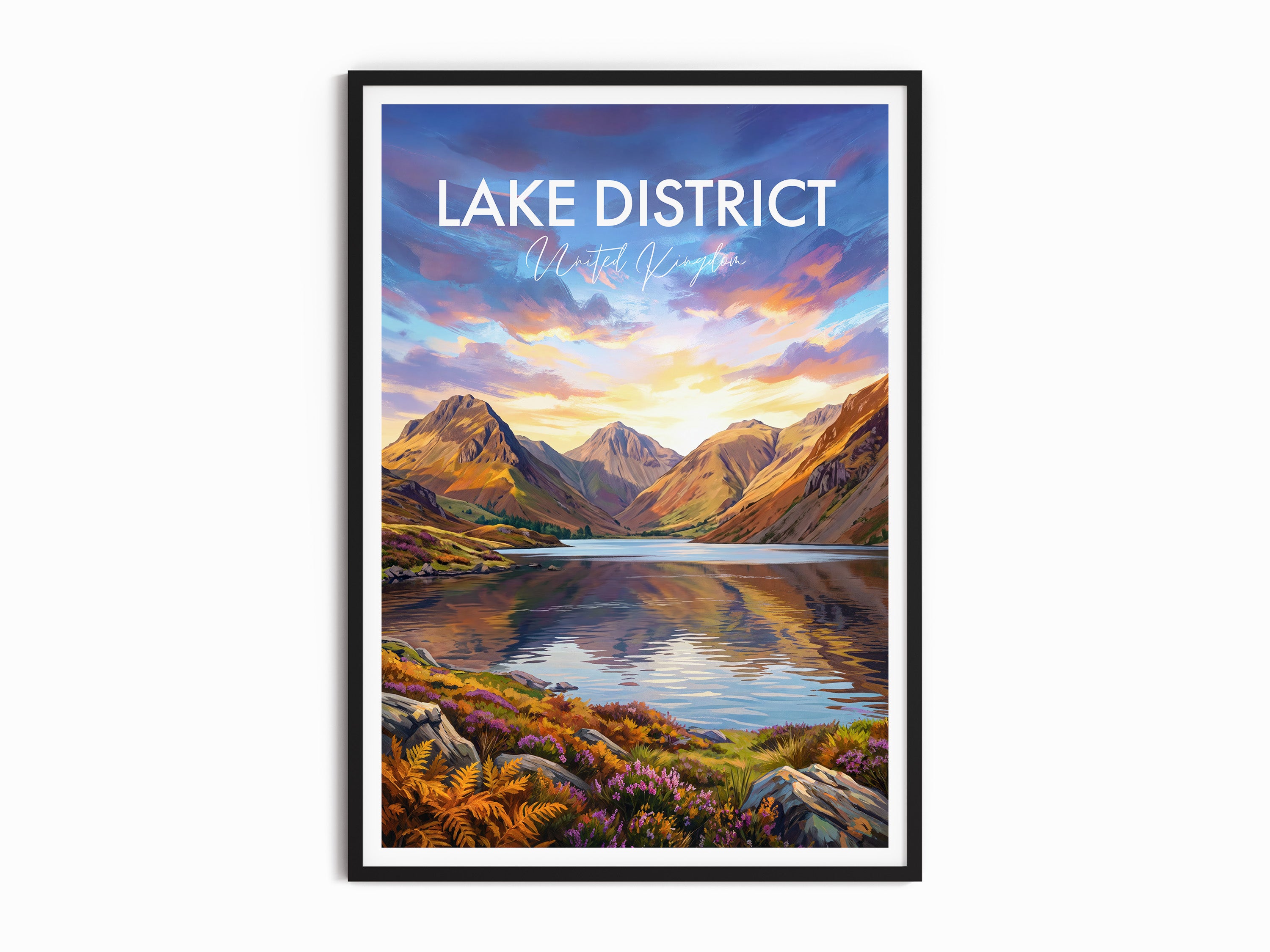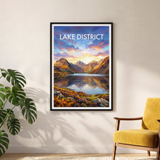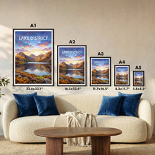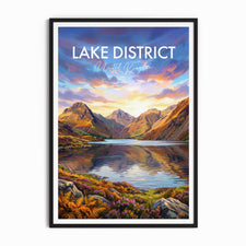 Experience the beauty of the Lake District with this Wasdale Fells print. Featuring the iconic Scafell Pike, Great Gable, Yewbarrow and Kirk Fell reflecting in the Wast Water lake. Perfect for any home or office, this travel poster captures the stunning landscape of the United Kingdom. Celebrate the charm of Wasdale Fells and its picturesque mountains, a must-have for fans of Lake District art and British nature decor.