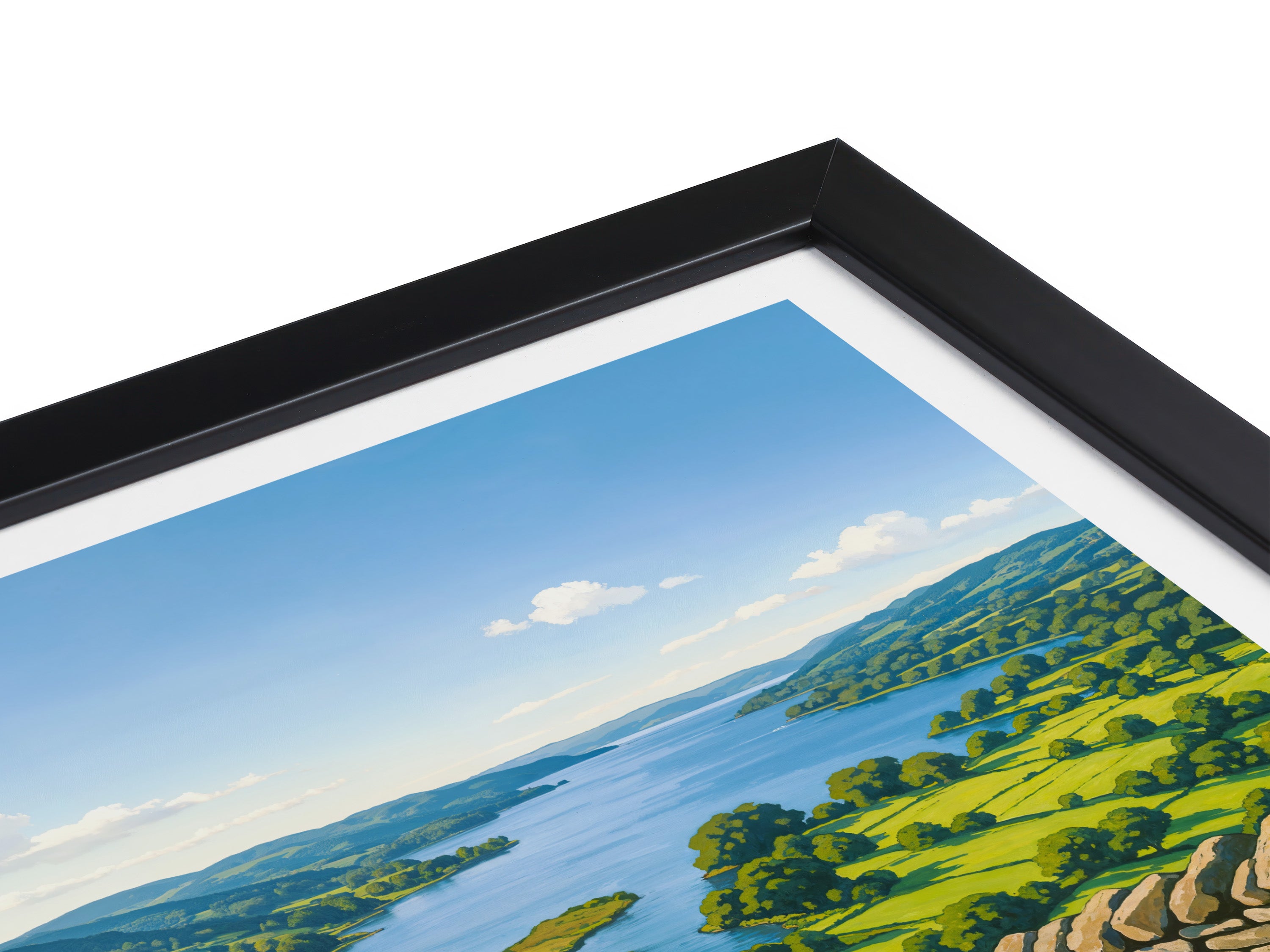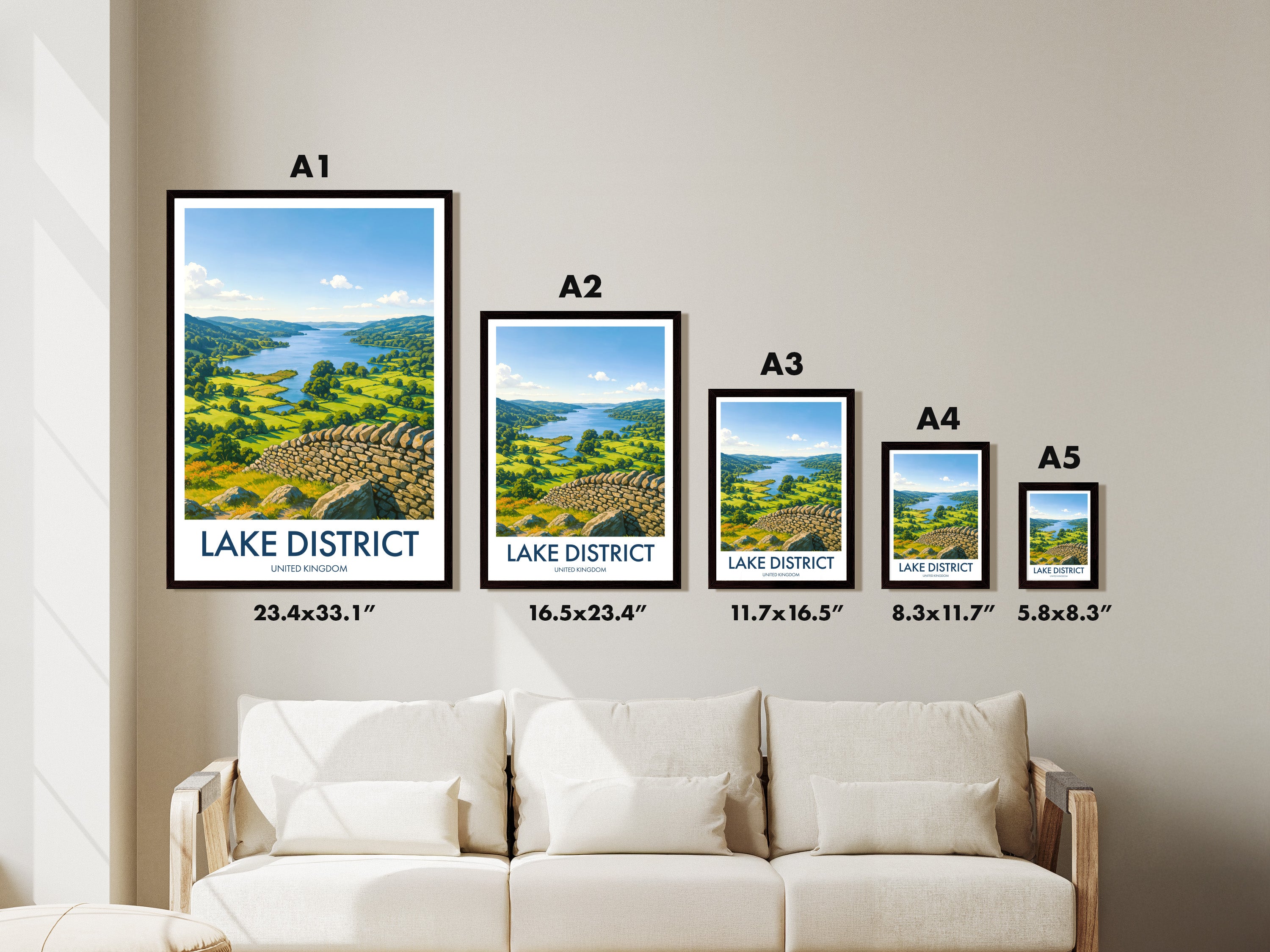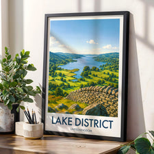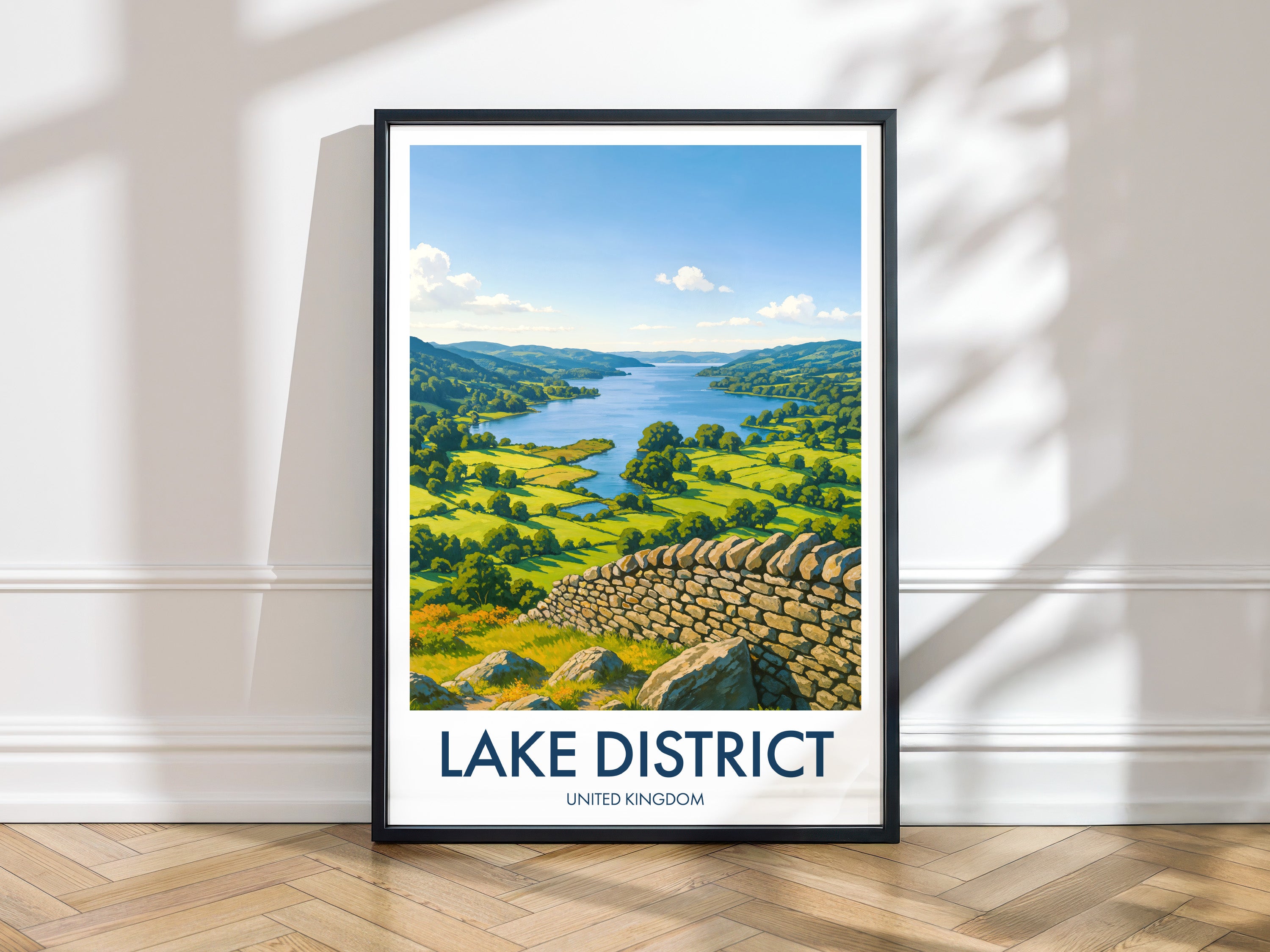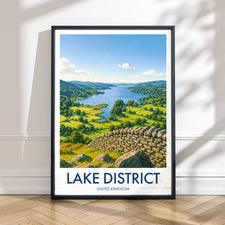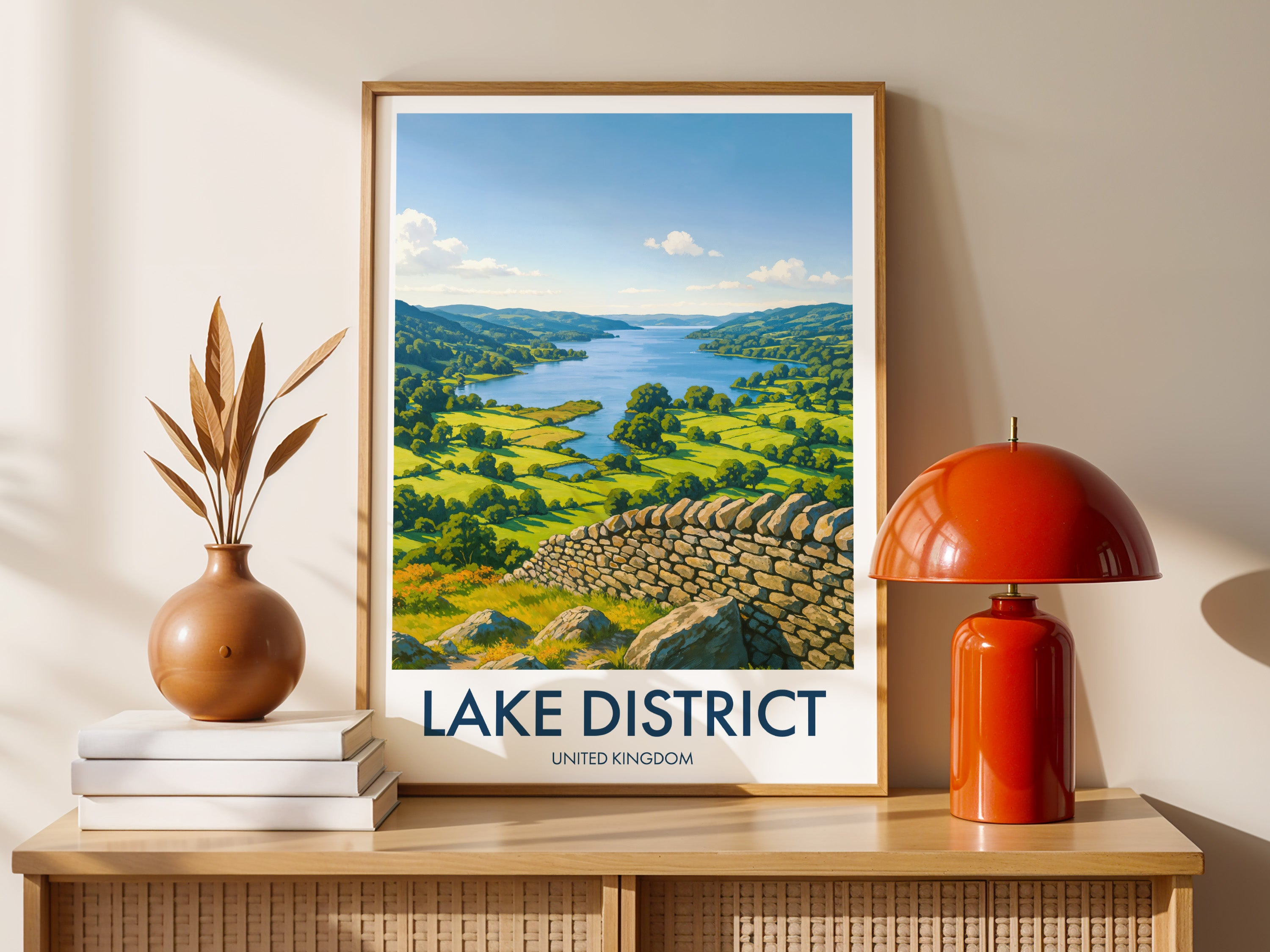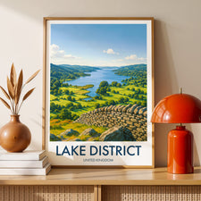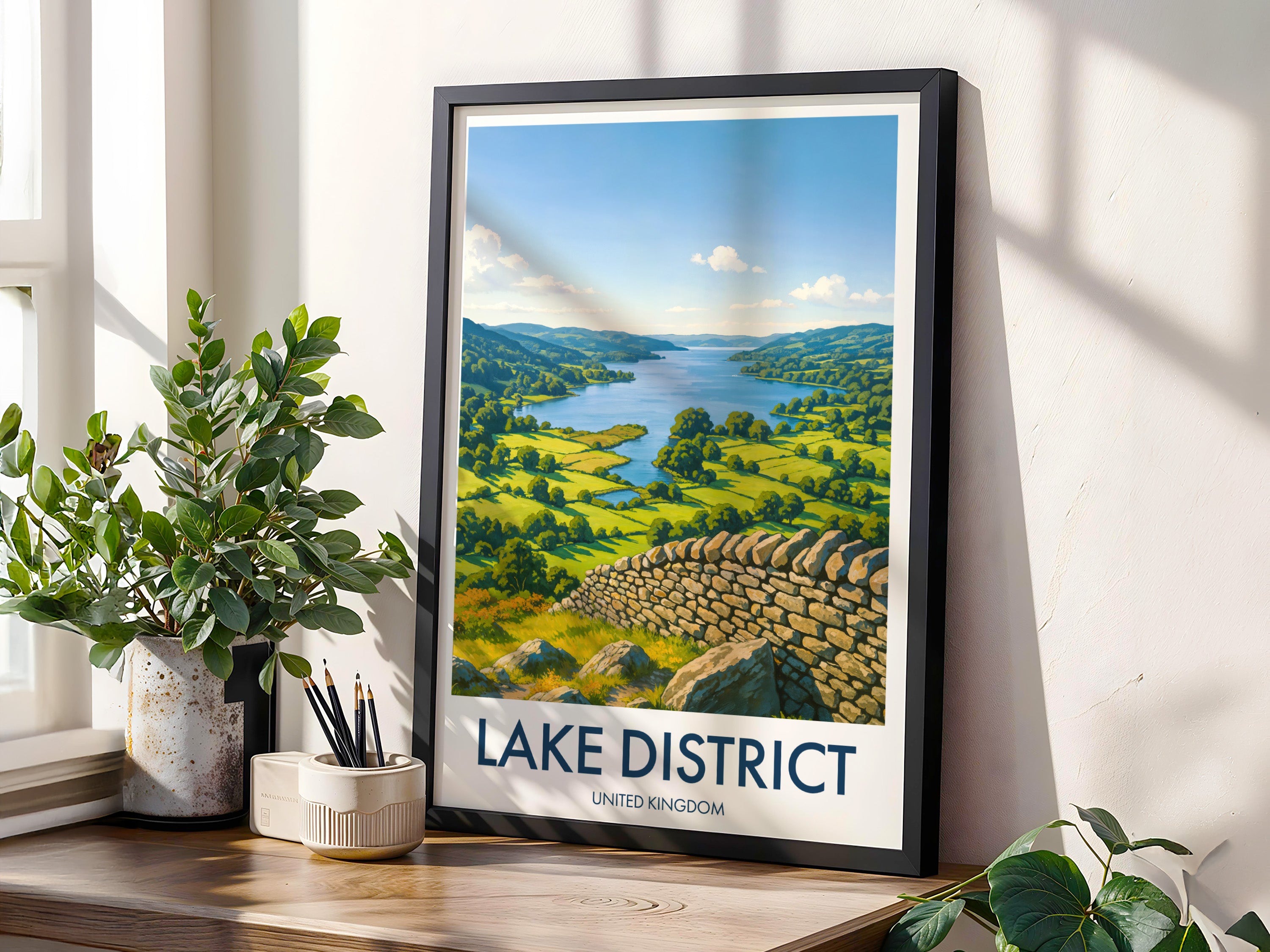 Capture the beauty of Windermere in the Lake District with this illustrated travel poster. Showcasing the UK's largest natural lake, nestled in the iconic national park.